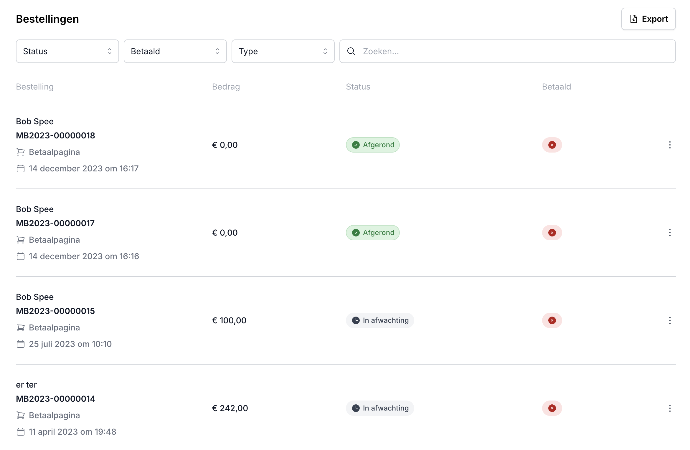 Betalingen via SEPA-incasso staan na het aanmaken van de bestellingen meestel enkele werkdagen op "In Afwachting". Na het ontvangen van de betaalbevestiging van de bank worden deze op "Betaald" gezet. Terugkerende betalingen met Creditcard komen wel direct op "Betaald" te staan.