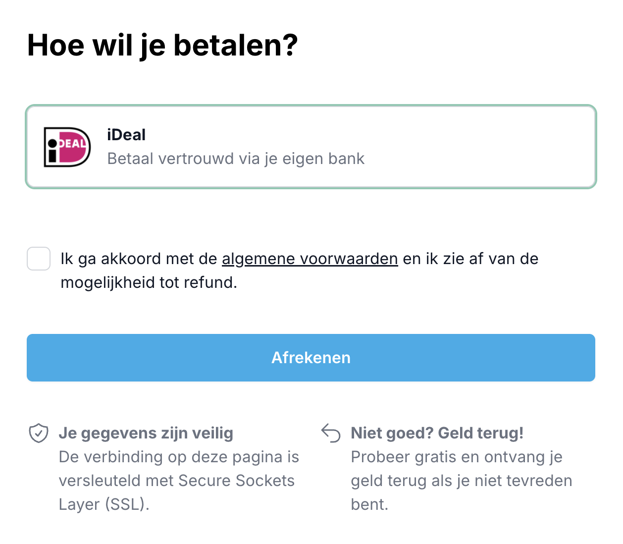 Op de betaalpagina kiest een gebruiker de betaalmethode waar de bestelling mee afgerekend gaat worden. Na het bevestigen van de bestelling wordt de gebruiker doorgestuurd naar het betaalscherm van deze betaalmethode. In het geval van iDEAL is dat bijvoorbeeld de pagina van de gekozen bank.