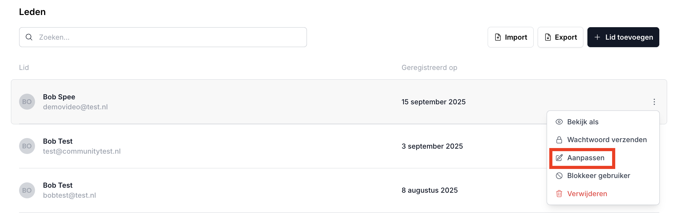 De gegevens van leden zijn eenvoudig aan te passen door het lid simpelweg op te zoeken en op zijn of haar naam te klikken.