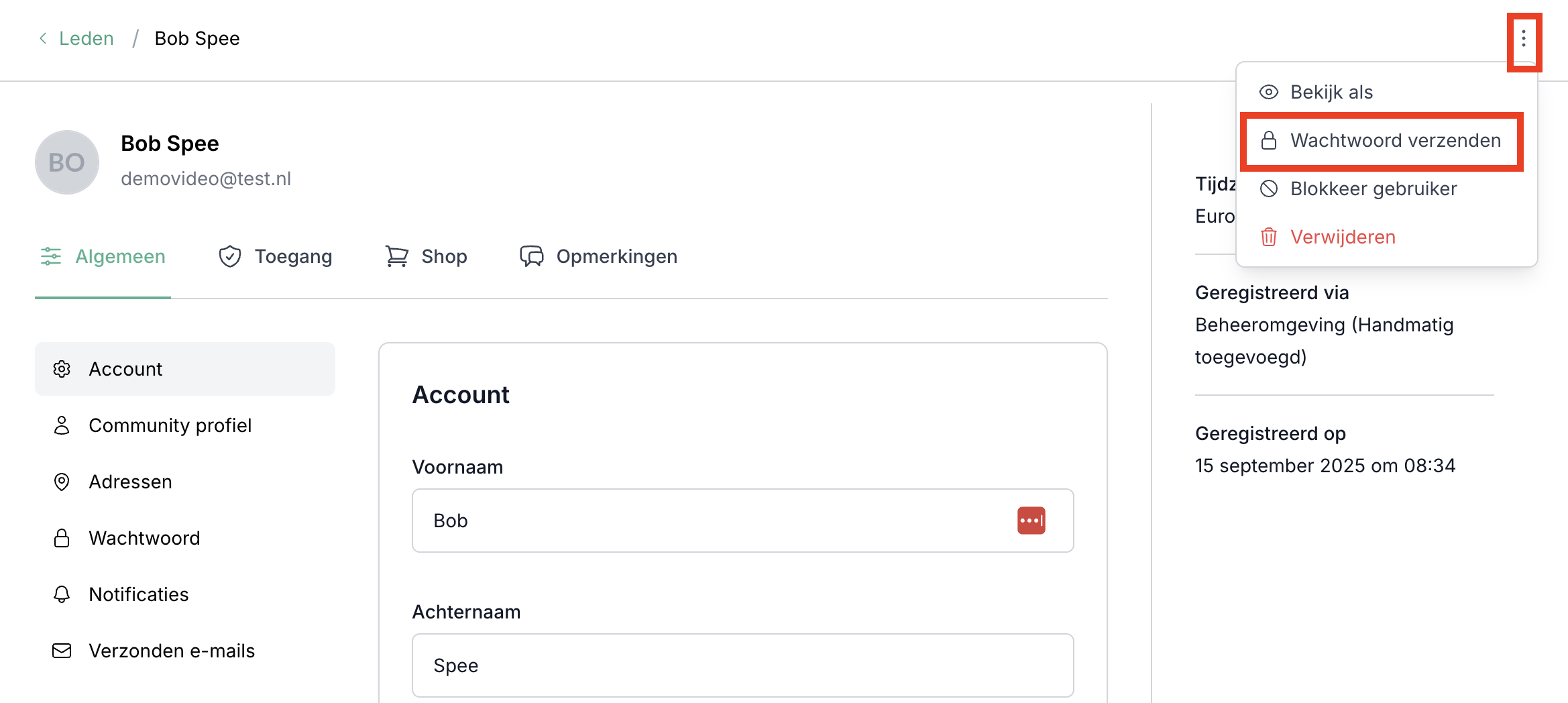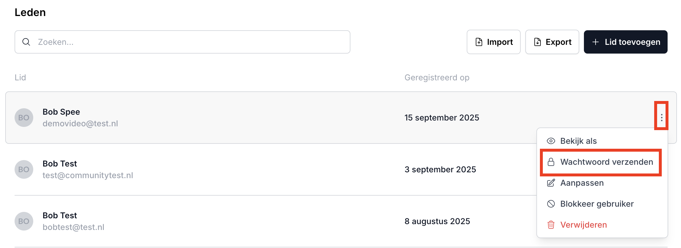 Optie 1: Zoek het betreffende lid op, klik op de 3 puntjes aan de rechterzijde en kies simpelweg voor "Wachtwoord verzenden".
