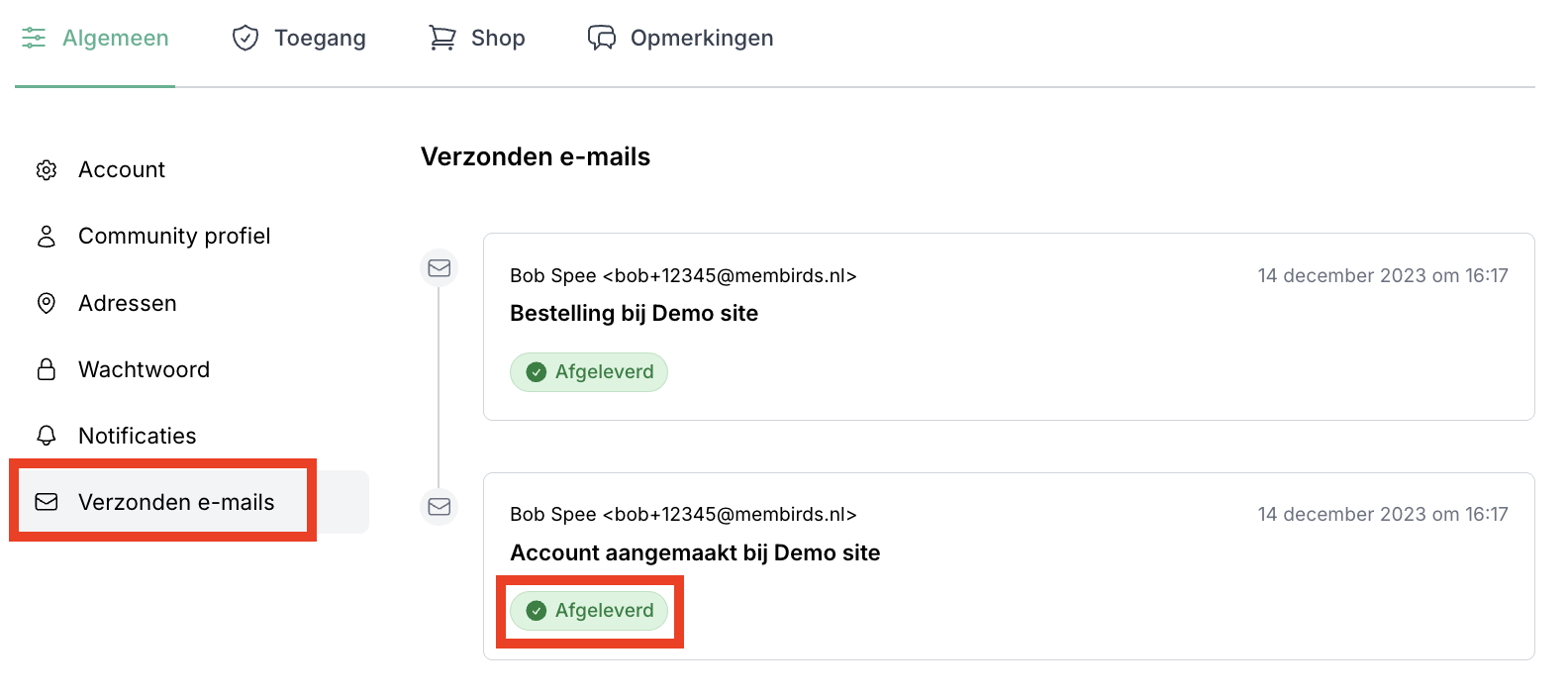 Na het aanmaken van het nieuwe lid kun je indien gewenst bij "Verzonden e-mails" controleren of de mail met daarin het wachtwoord correct is verzonden en is afgeleverd.