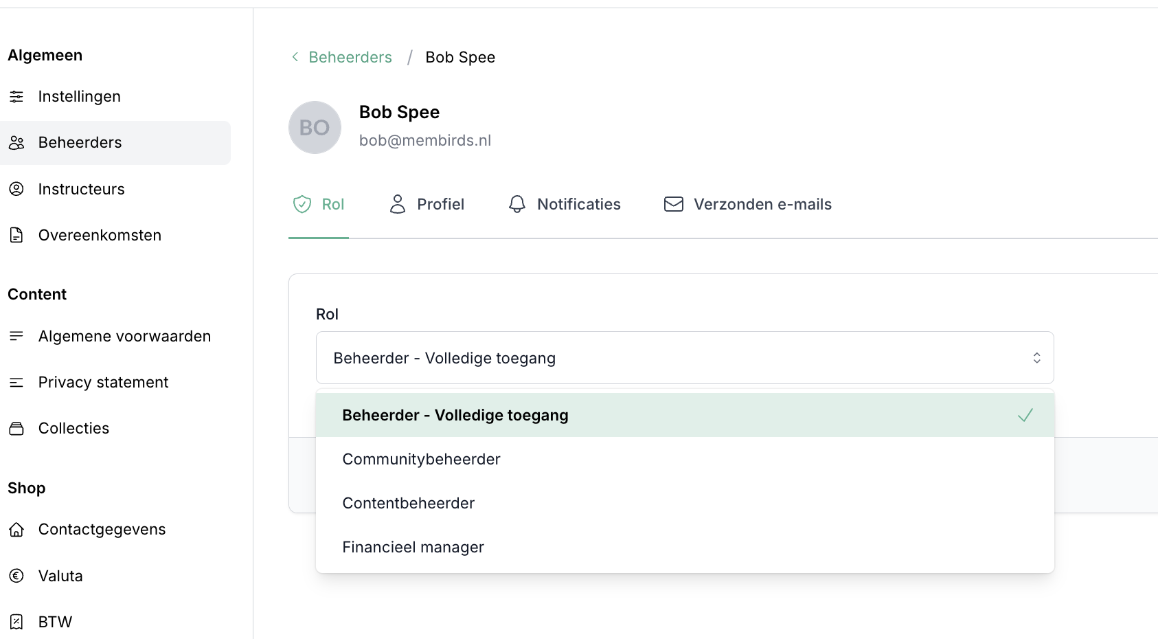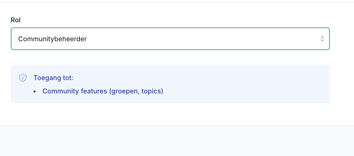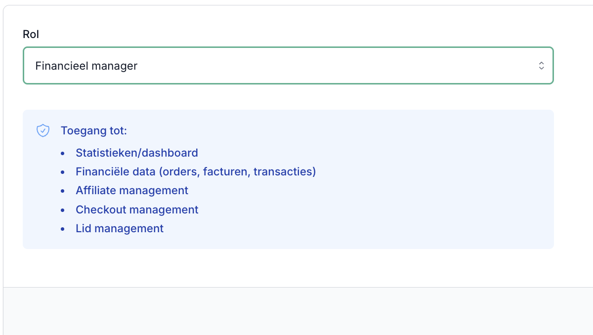Daarnaast kun je een rol toevoegen. Beheerder - Volledige toegang, community beheerder, content beheerder of financieel manager. Als je op de rol klikt komt er ook bij te staan tot welke functies deze rol toegang heeft. Ideaal als je bijvoorbeeld een VA hebt die alleen de content in de cursussen hoeft goed te zetten, dan kun je kiezen voor content beheerder.
