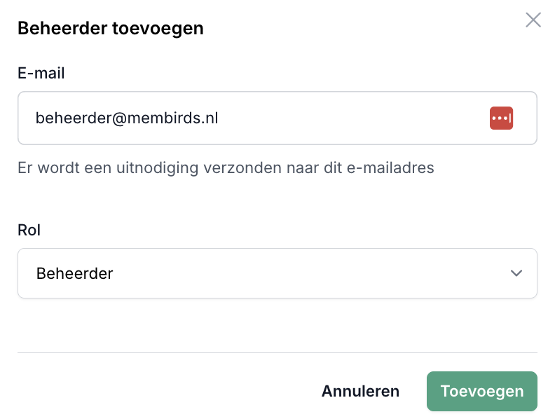 Ga in je MemBirds dashboard naar "Instellingen" en kies vervolgens voor de optie "Beheerders". Klik nu op "Beheerder toevoegen" en voer het mailadres in van de nieuwe beheerder die je wil toevoegen.