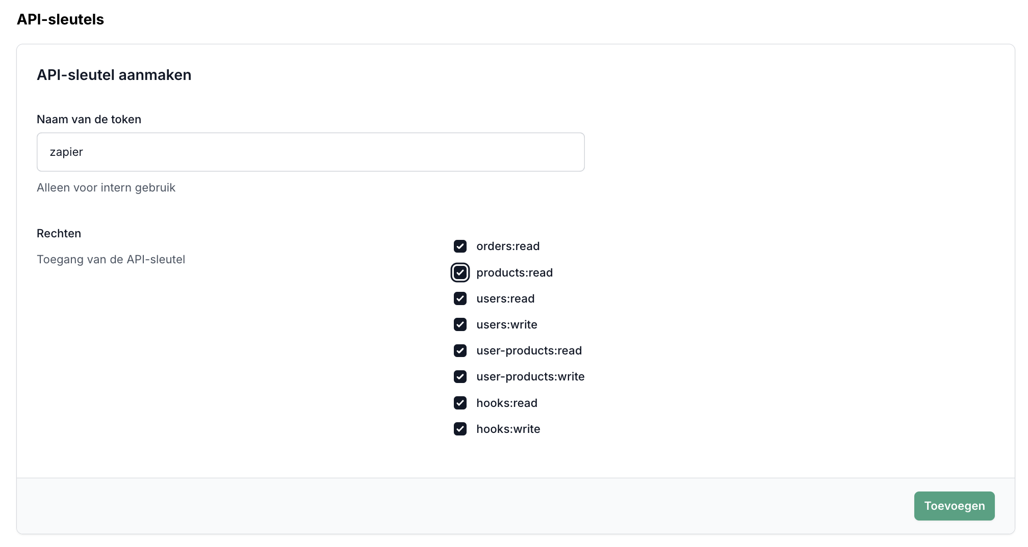 Stap 9: Maak een API sleutel aan binnen MemBirds. Dit doe je door te gaan naar Instellingen > Geavanceerd > API-sleutels. Geef de API-sleutel een naam, vink alle velden aan de rechterzijde aan en klik op "Toevoegen". Kopieer de API-sleutel die in beeld verschijnt en plak deze in Zapier. Klik nu in Zapier op "Yes, continue".
