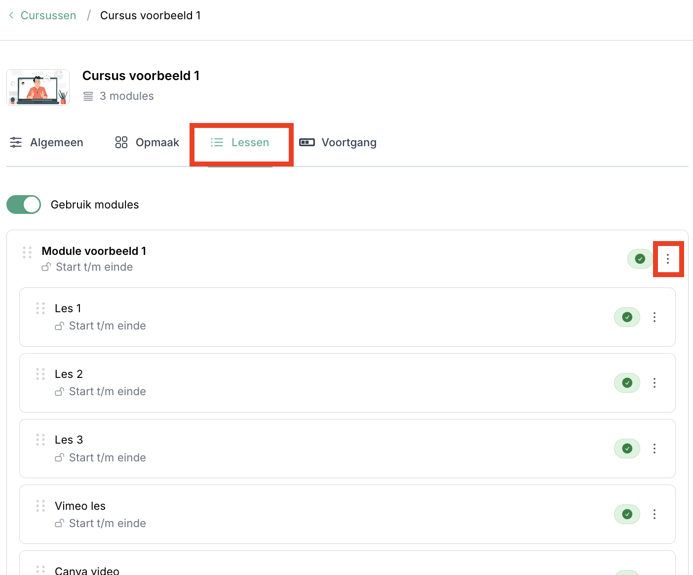 3: Wil je de modules en/of lessen binnen een cursus gefaseerd vrijgeven? Ga dan naar "Content", selecteer de betreffende cursus en ga naar de module of les die je wil aanpassen. Hier kun je op de drie puntjes rechts klikken, voor zowel een Module als les. Dan kom je op een scherm waarbij je de startdatum en einddatum kunt instellen.