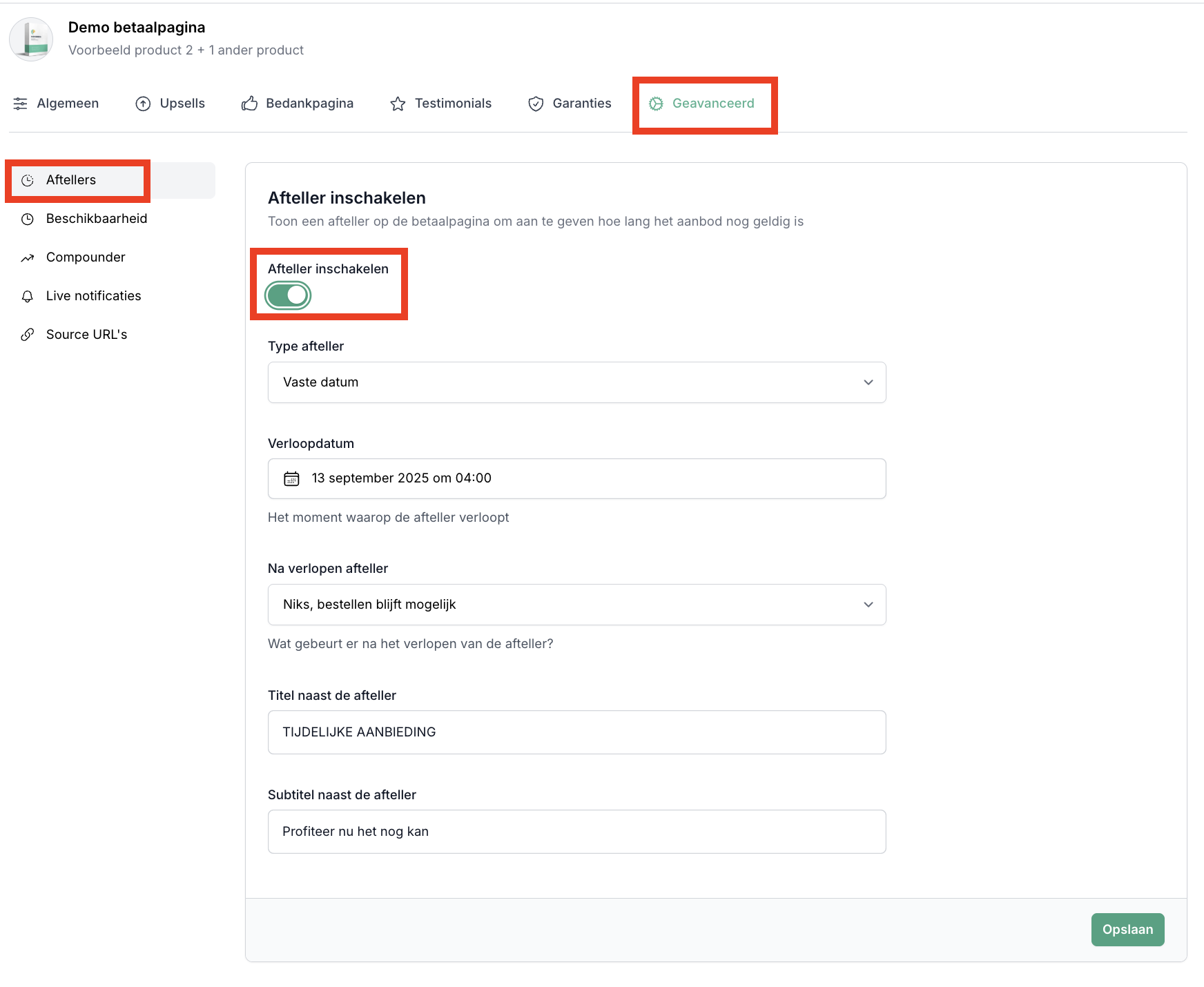Op de betaalpagina van je product heb je de mogelijkheid om een afteller toe te voegen om je klanten te laten weten wanneer dit aanbod verloopt. Je kunt dit als volgt instellen: