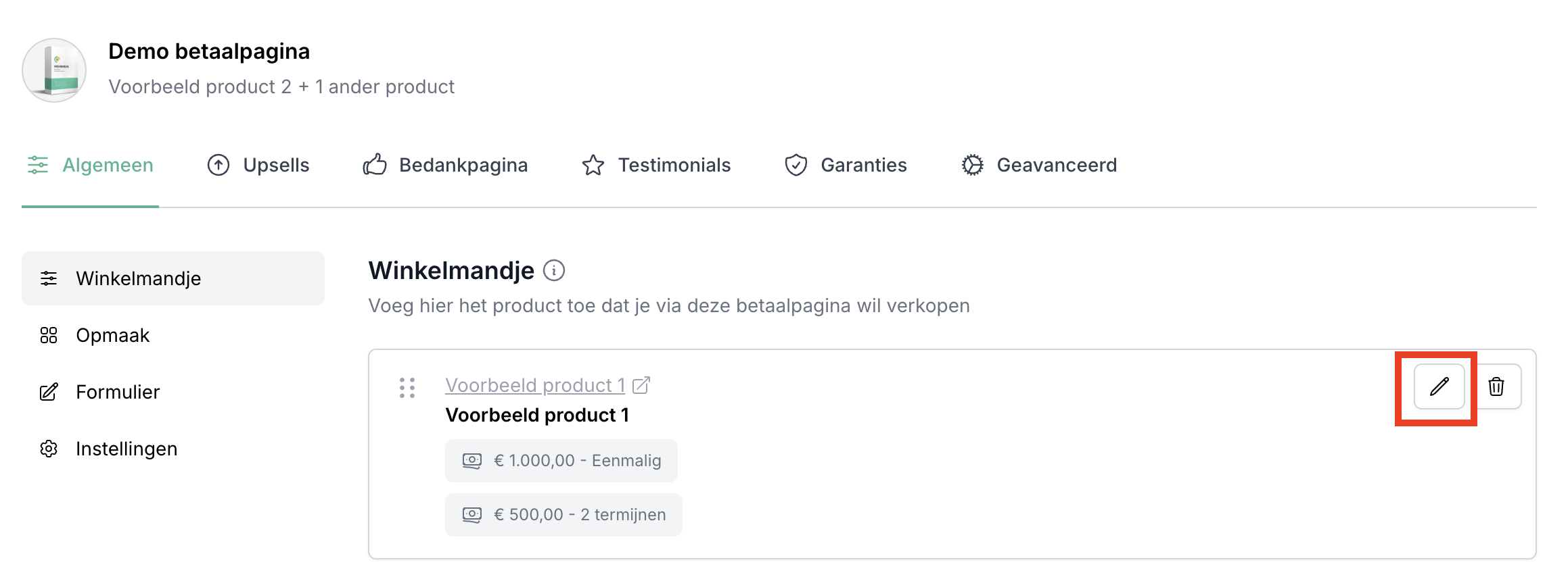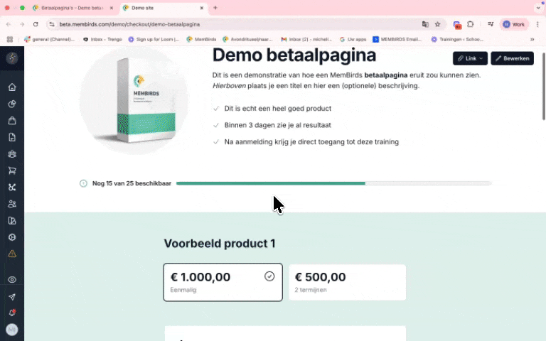 Om leden zelf het startmoment van toegang tot je product te laten bepalen ga je naar de MemBirds betaalpagina van dit product. Hier klik je bij het product dat in het winkelmandje zit op het Pen-icoontje.
