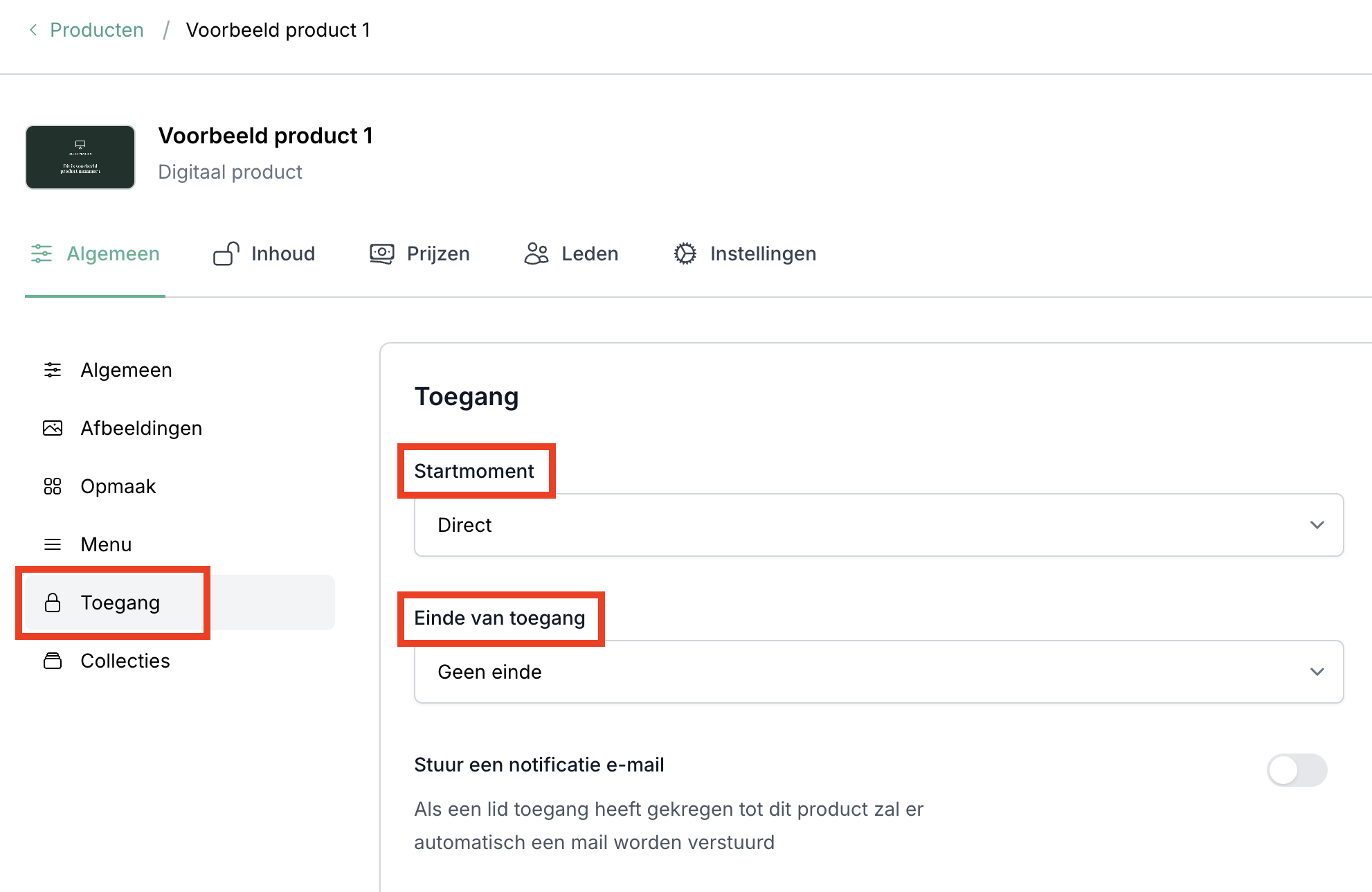 Om de toegang op productniveau in te stellen ga je bij het betreffende product naar "Toegang". Hier kun je het startmoment en het einde van de toegang bepalen. Deze instellingen worden nadat je op "Opslaan" geklikt hebt toegepast op alle nieuwe toegangen. Leden die reeds toegang hadden tot dit product blijven ongewijzigd.