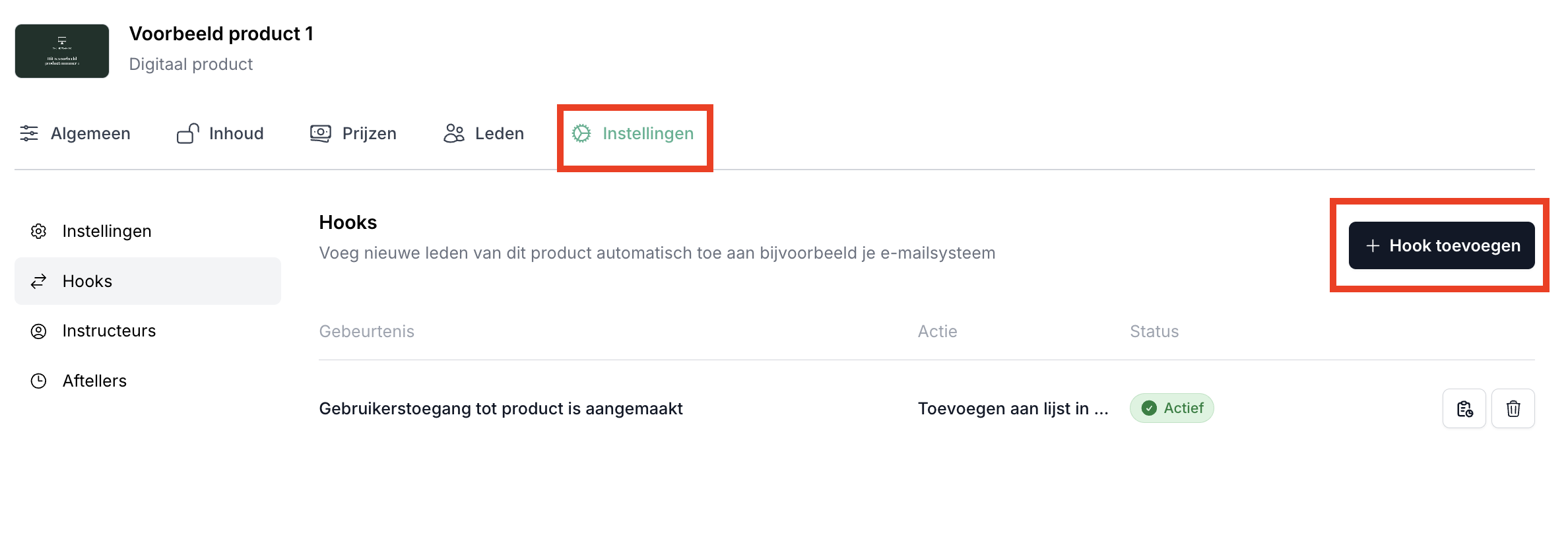 Bij het product klik je op "Hooks" en kies je voor "Hook toevoegen".