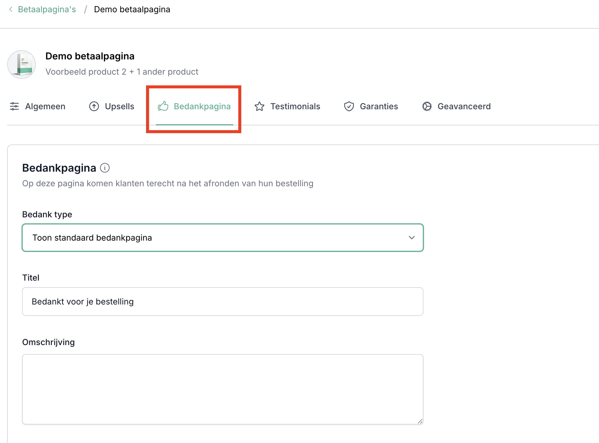 Je kunt de bedankpagina instellen door onder "Shop" naar de betaalpagina van het product te gaan. Hier klik je vervolgens op het tabje "Bedankpagina".