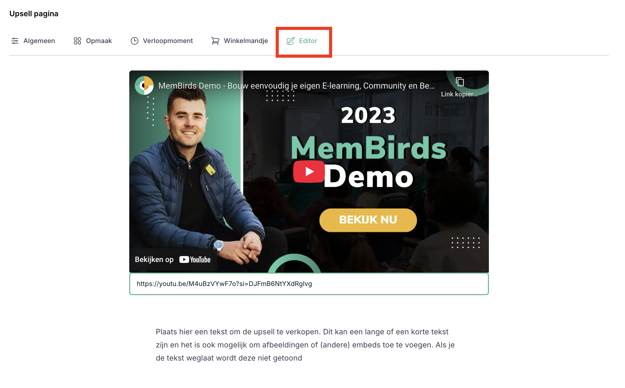 Rechtsboven in beeld vind je de "Editor" button. Door hier op te klikken kun je de inhoud van de pagina naar wens aanpassen en bijvoorbeeld een video en/of tekst toevoegen.