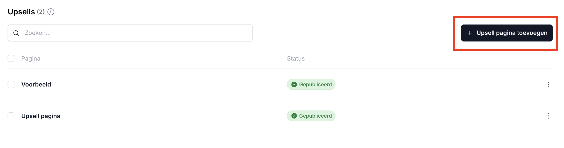 Om een upsell pagina aan te maken ga je onder "Shop" naar "Upsells" en klik je op "Upsell pagina aanmaken". Geef de upsell pagina nu een naam.
