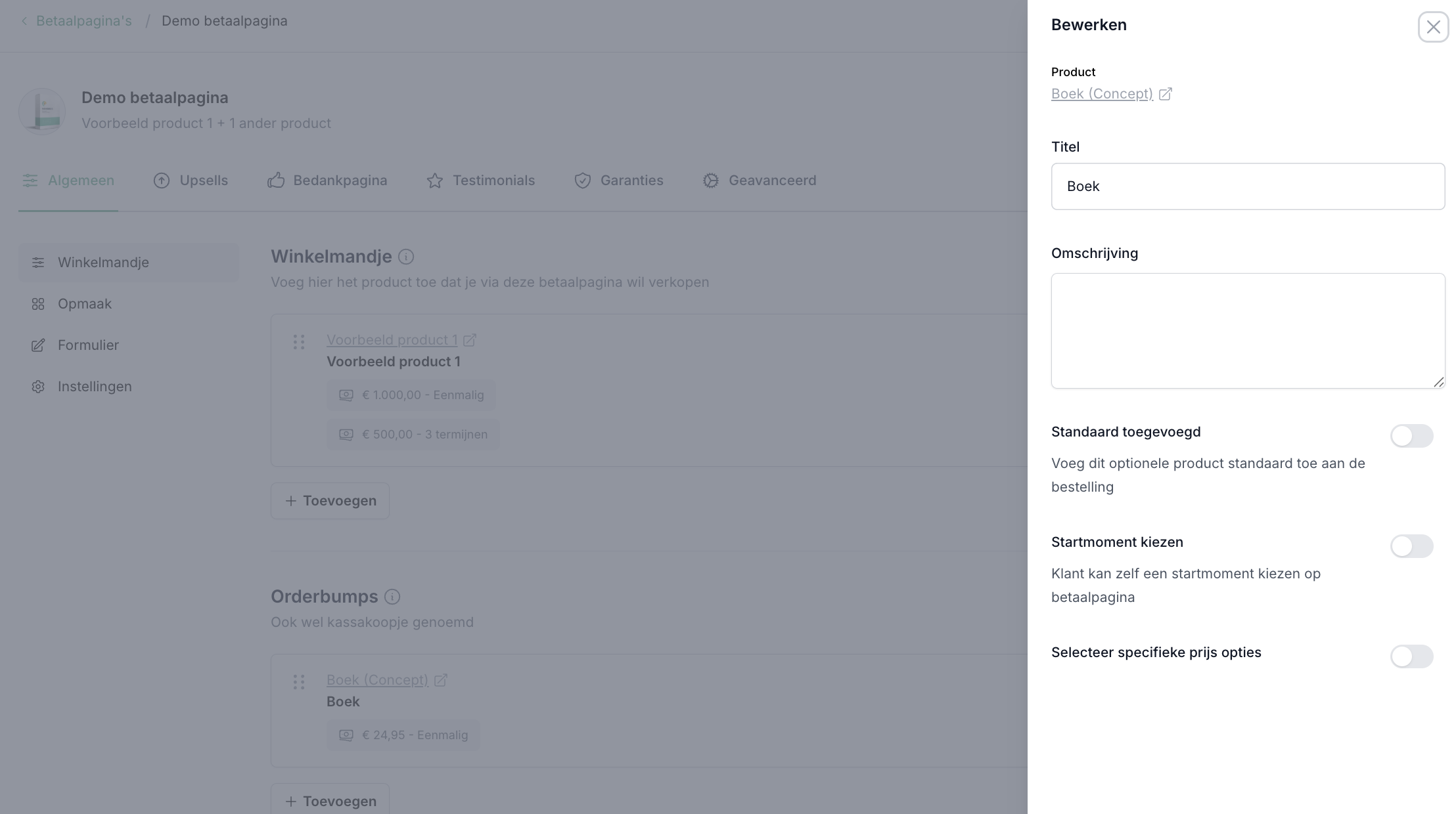 Nadat je het reguliere product wat op deze pagina verkocht wordt hebt toegevoegd ("Voorbeeld product 1" in bovenstaande afbeelding) kun je onder "Orderbumps" op "Toevoegen" klikken om een orderbump / kassakoopje toe te voegen. Hier kun je vervolgens elk willekeurig product uit je ledensite selecteren.