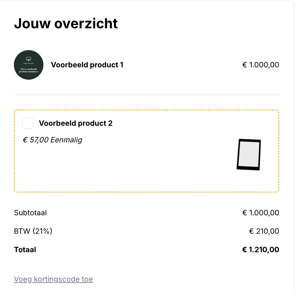 Een voorbeeld van hoe een orderbump / kassakoopje / cross-sell er op de betaalpagina uit kan zien zie je in de afbeelding hieronder (omlijnd met de oranje stippellijn).