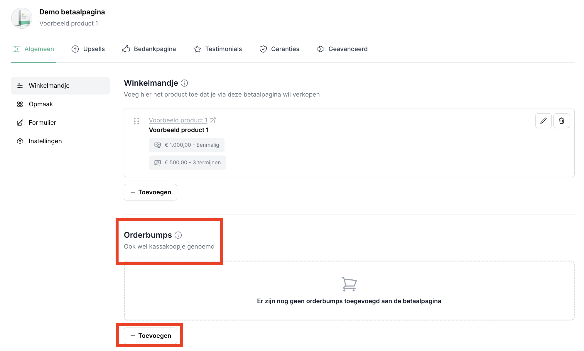 Het hebben van een orderbump / kassakoopje / cross-sell kan een goede manier zijn om de gemiddelde orderwaarde per klant te verhogen. Je kunt dit eenvoudig toevoegen aan je checkout door bij de betaalpagina waar je de orderbump wil toevoegen naar het tabblad "Winkelmandje" te gaan.