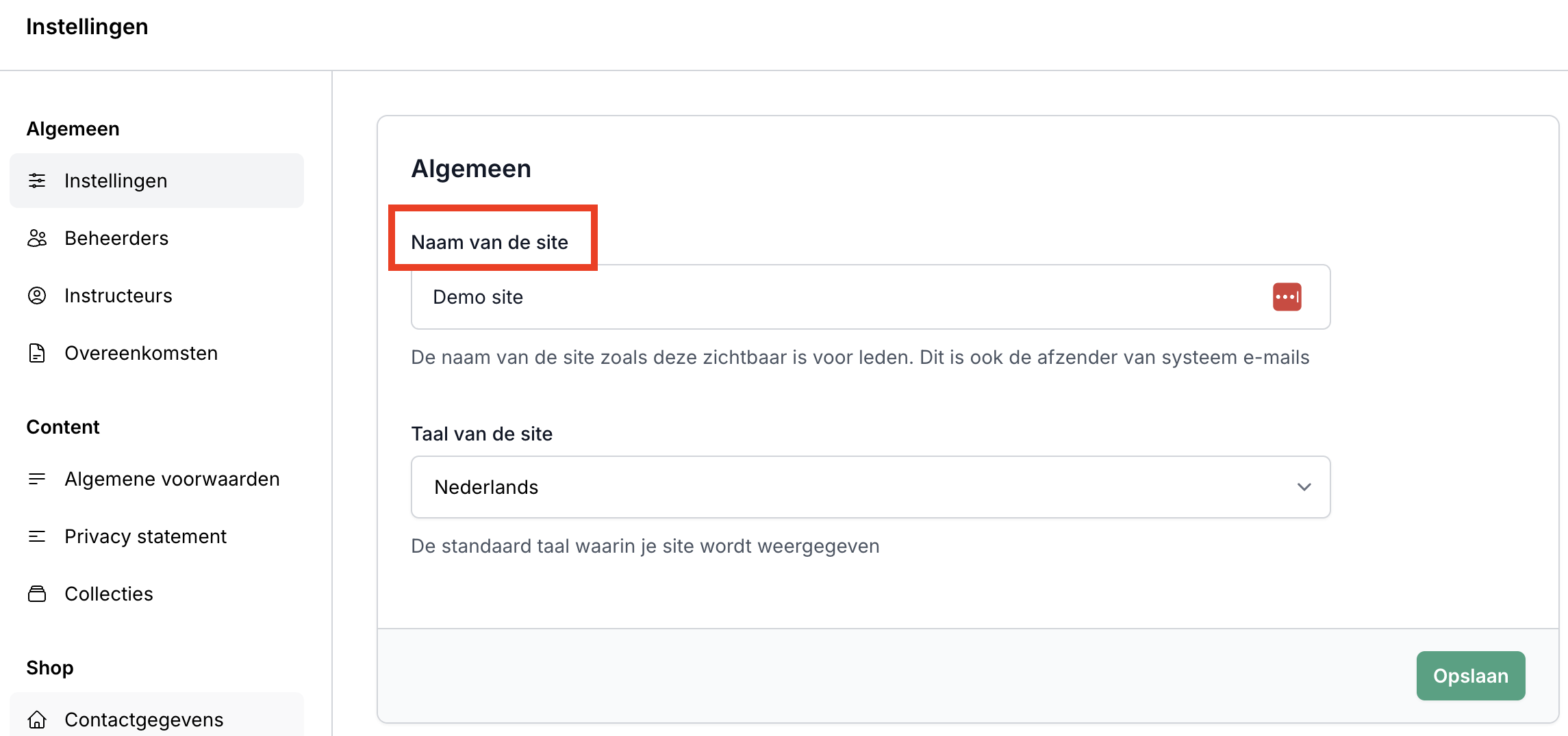 De naam van je site wijzigen kun je eenvoudig doen door te klikken op Instellingen > Algemeen > Naam van de site. Hier kun je ten alle tijden de gewenste naam invoeren.
