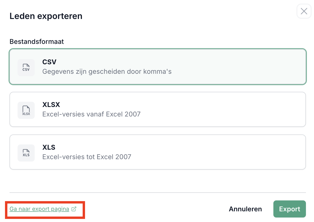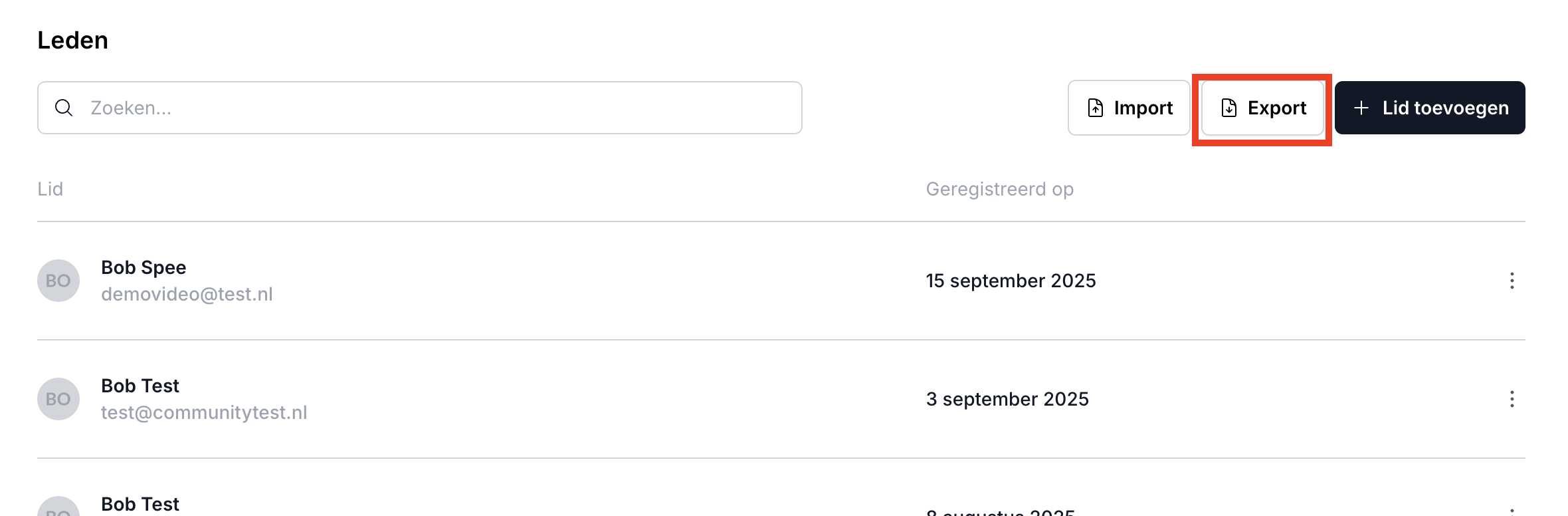 Stap 1: Ga vanuit de beheeromgeving naar het element dat je wil exporteren (Leden bijvoorbeeld) en klik simpelweg op "Exporteren".