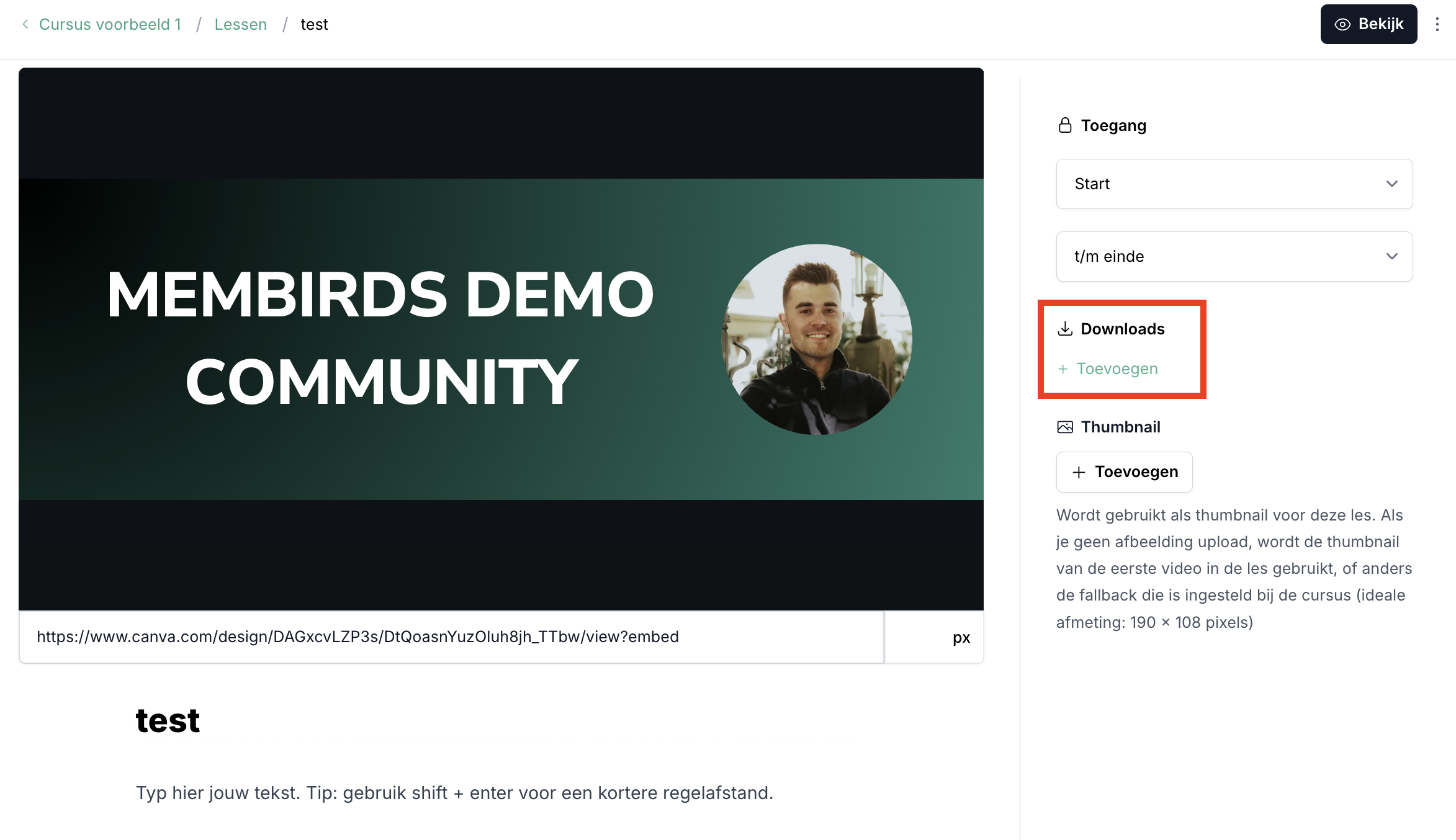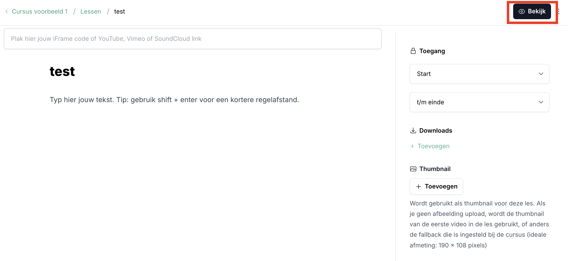 Je kunt je les altijd bekijken door rechtsboven op "Bekijk" te klikken. Op die manier kun je tevens zien hoe jouw leden je les te zien zullen krijgen.