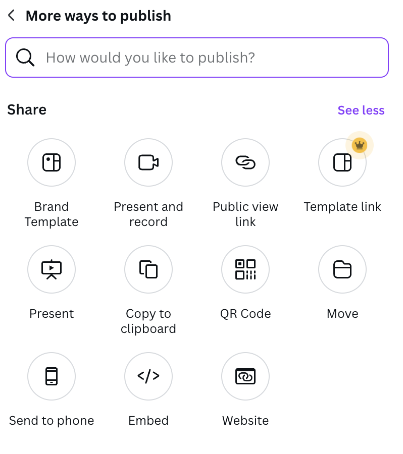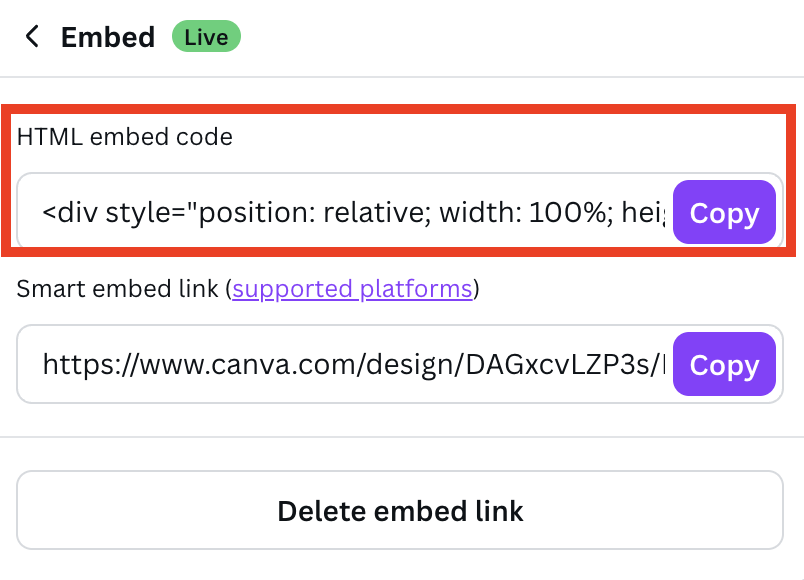 Binnen het Embed blok in een les is het ook mogelijk om iFrame codes te plakken. Op deze manier kun je leden bijvoorbeeld documenten uit Canva, Google Slides, Prezi-presentaties en/of Loom video's binnen je MemBirds omgeving laten bekijken. Hoe je dit doet is door de iFrame code of link op te halen bij het platform waarvan je de content wil tonen in de les en deze vervolgens te plakken in het Embed blok. Hieronder zie je hoe dat er bij Canva uitziet.