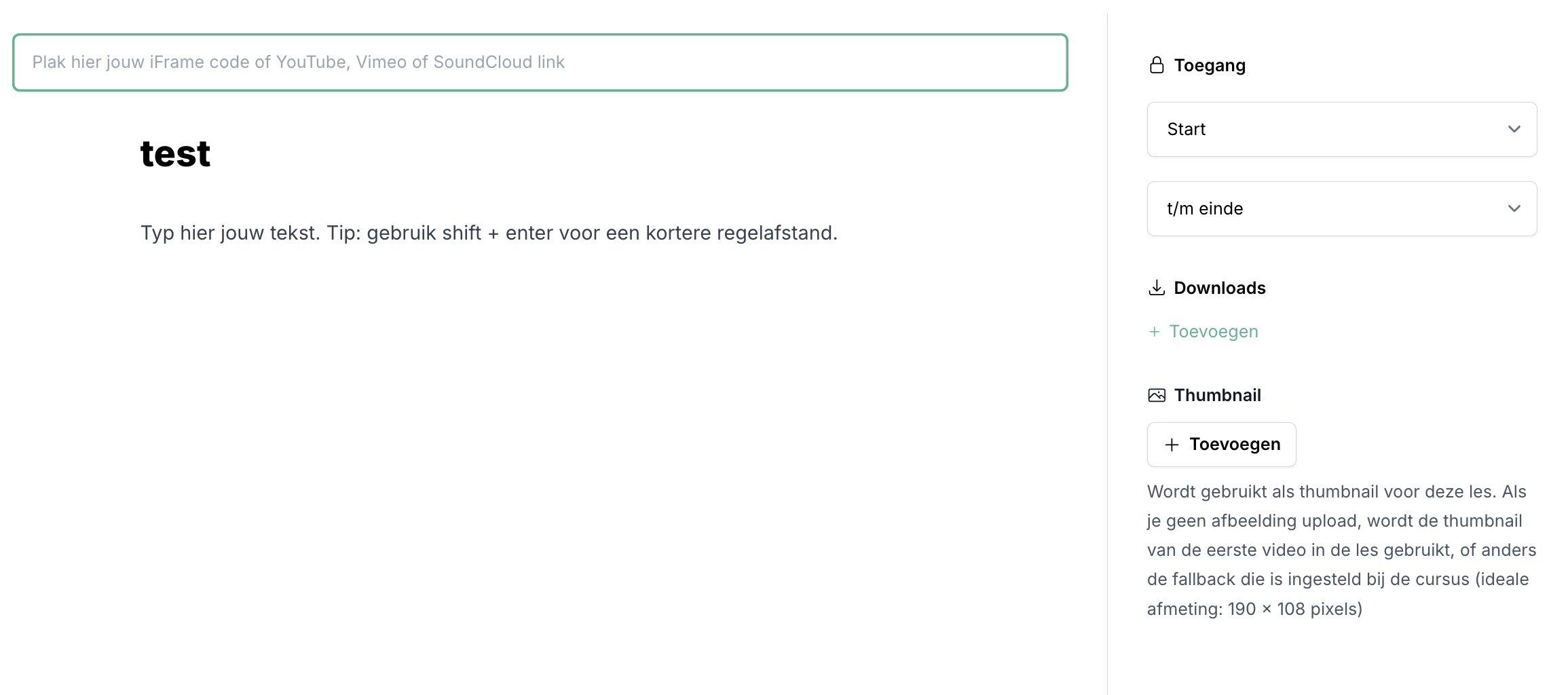 In de les kun je gelijk een tekst toevoegen.. Wanneer je getypte tekst selecteert kun je deze bovendien eenvoudig bewerken. Denk hierbij bijvoorbeeld aan het maken van kopregels, vet drukken of het invoegen van links. Pro tip: Wil je minder ruimte tussen de regels? Gebruik Shift + Enter. 😉