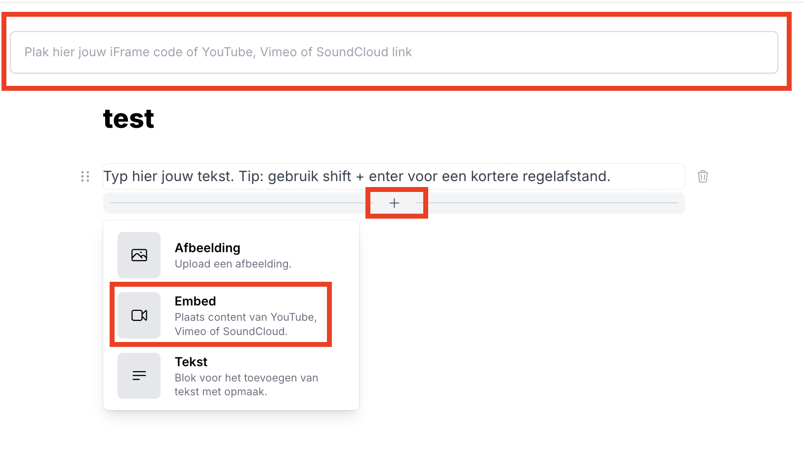 Een video toevoegen kun je eenvoudig doen door bovenin de link te plaatsen in het embed veld. Wil je nog een video toevogen? Klik dan op "+" te klikken, "Embed" te selecteren en vervolgens de link van je video in te voeren. Dit werkt voor zowel Vimeo als (verborgen) YouTube video's (let bij YouTube op dat je video niet op "privé" staat, maar op "verborgen"). In dit artikel vind je een meer uitgebreide uitleg over het toevoegen van YouTube video's. Gebruik je liever Vimeo? Check dan dit artikel. In het kopje "Andere vormen van content embedden" hieronder lees je meer over hoe je video's van andere platforms op MemBirds kan plaatsen.