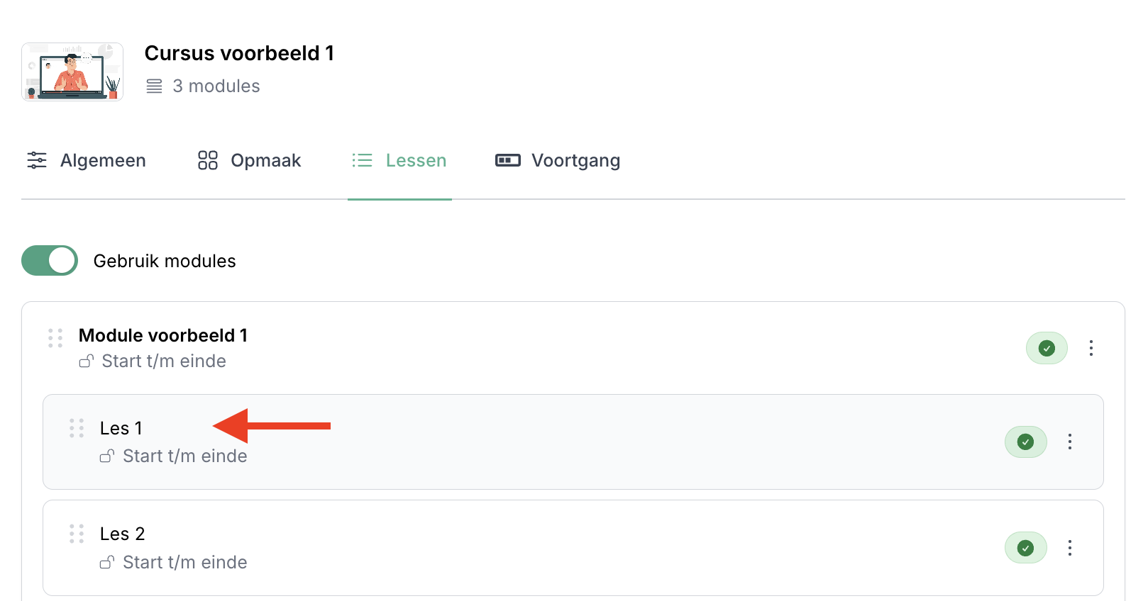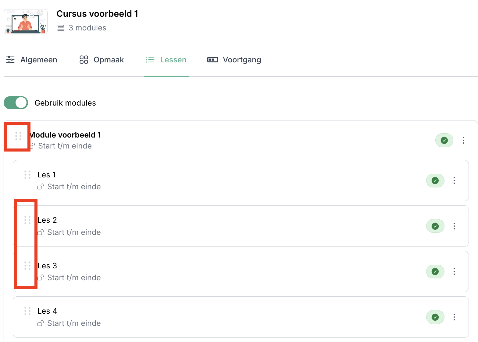 Wanneer je meerdere modules en/of lessen hebt aangemaakt, dan is de volgorde hiervan eenvoudig te wijzigen. Je kunt ze ook van de ene module naar de andere verslepen in hetzelfde product.