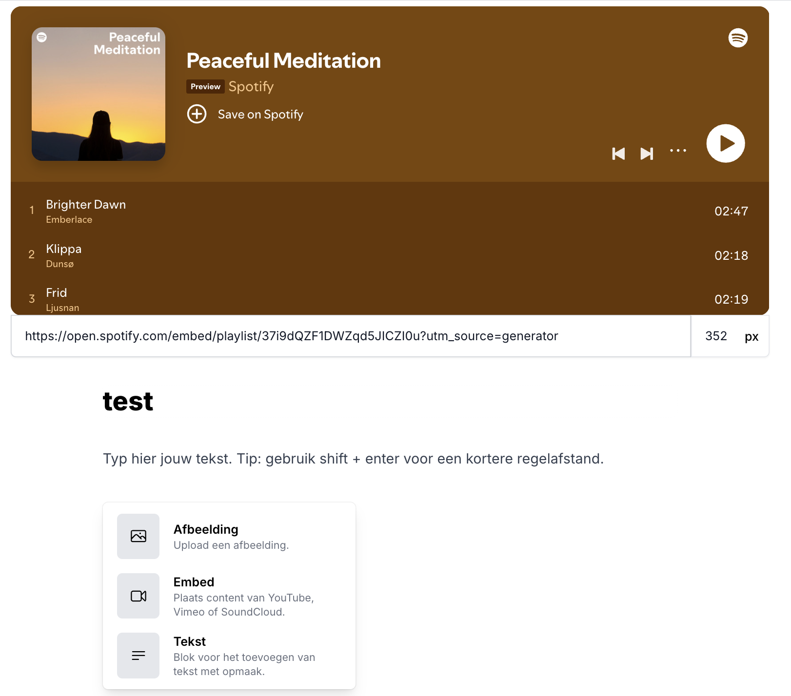 Audio toevoegen werkt vrijwel hetzelfde als het toevoegen van een video. Kopieer simpelweg de link van je audiobestand op SoundCloud, plak deze in het Embed blok.