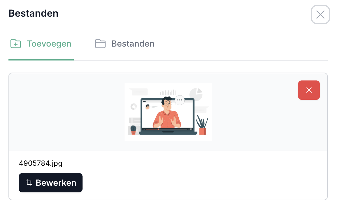 4. Snij de afbeelding bij indien gewenst. Dit kun je doen door op het pen-icoontje te klikken bij de afbeelding die je zojuist geüpload hebt. Gebruik voor het bijsnijden van je thumbnail de "Rechthoek" tool. De ideale afmeting voor een thumbnail is 1050 x 580 pixels. Als je een afbeelding in dat formaat uploadt, is bijsnijden niet nodig.
