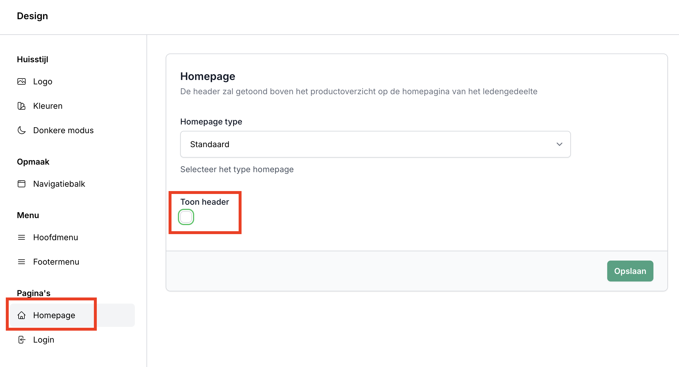 Om een header toe te voegen aan deze pagina ga je in het dashboard naar Design en dan kies je voor Homepage onder het kopje Pagina's.