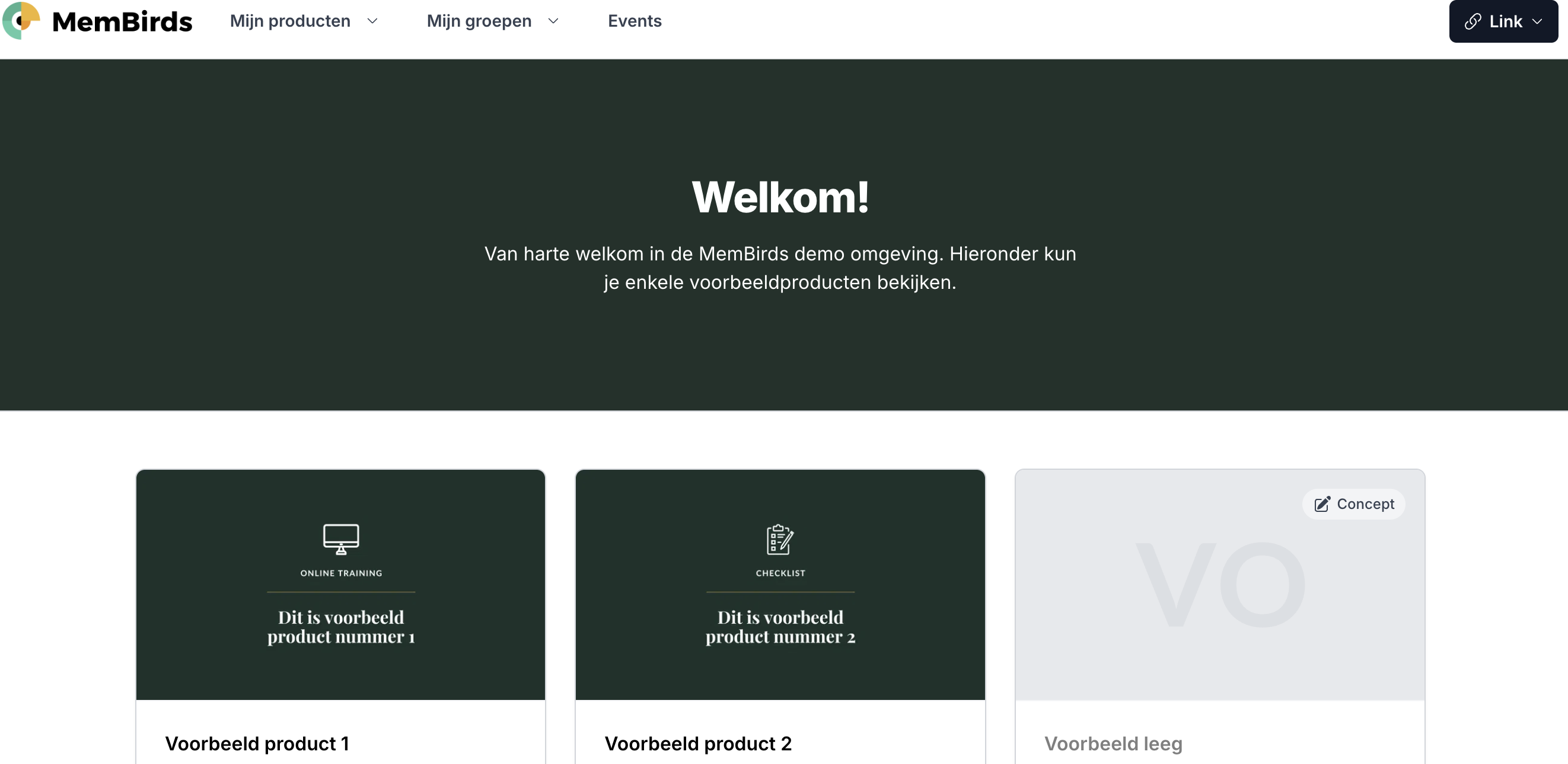 Op de standaard homepage van je MemBirds site zien leden een overzicht van alle producten waartoe hij of zij toegang heeft. Om deze pagina wat op te leuken en te laten passen bij je merk is er de mogelijkheid om hier aan header aan toe te voegen.