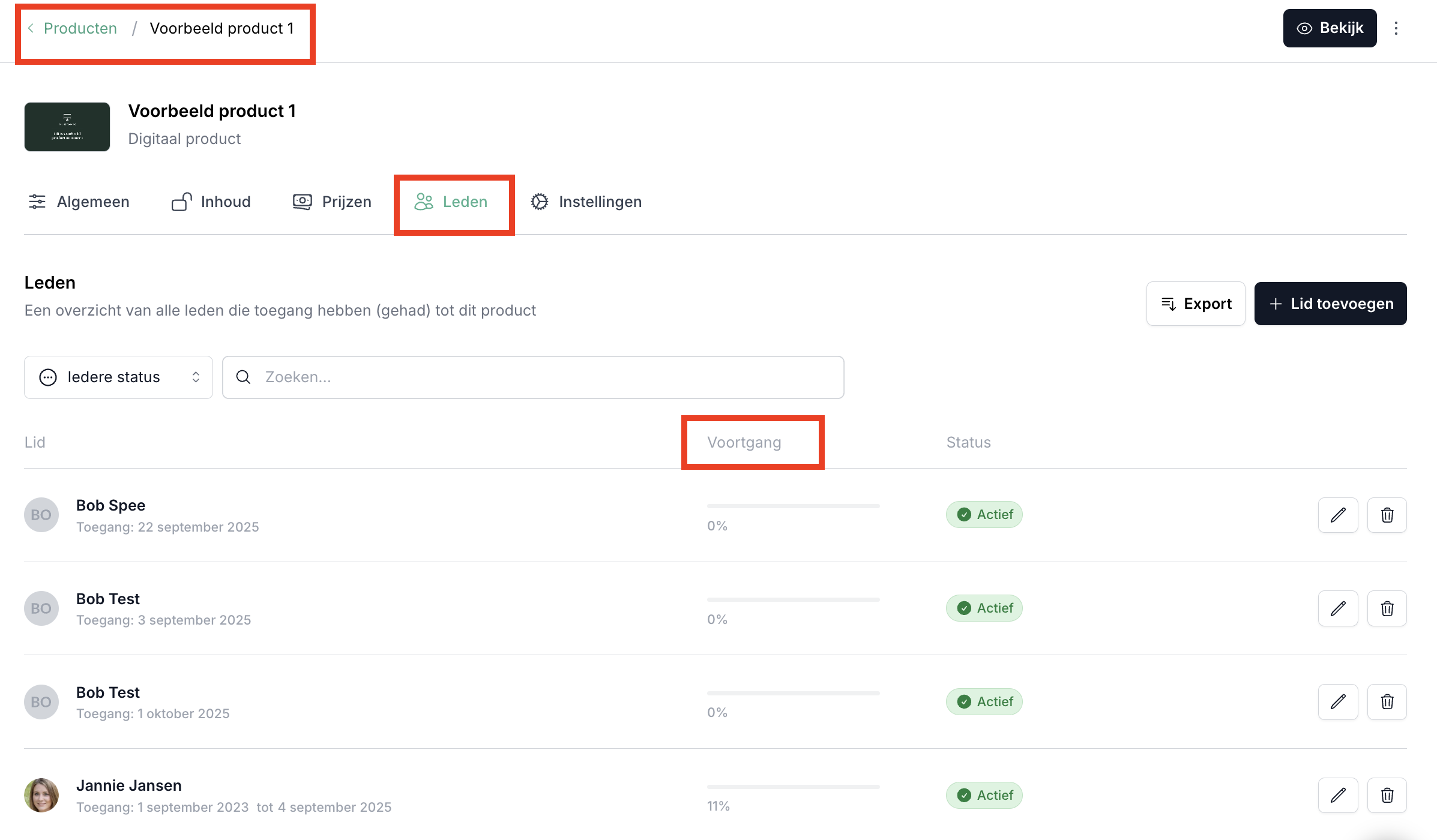 Binnen MemBirds is er de mogelijkheid om de voortgang van je leden in de gaten te houden. Je kunt dit heel eenvoudig doen op de volgende manier: Ga naar een product en klik op Leden. Hier wordt vervolgens de voortgang van je leden met het betreffende product weergegeven.