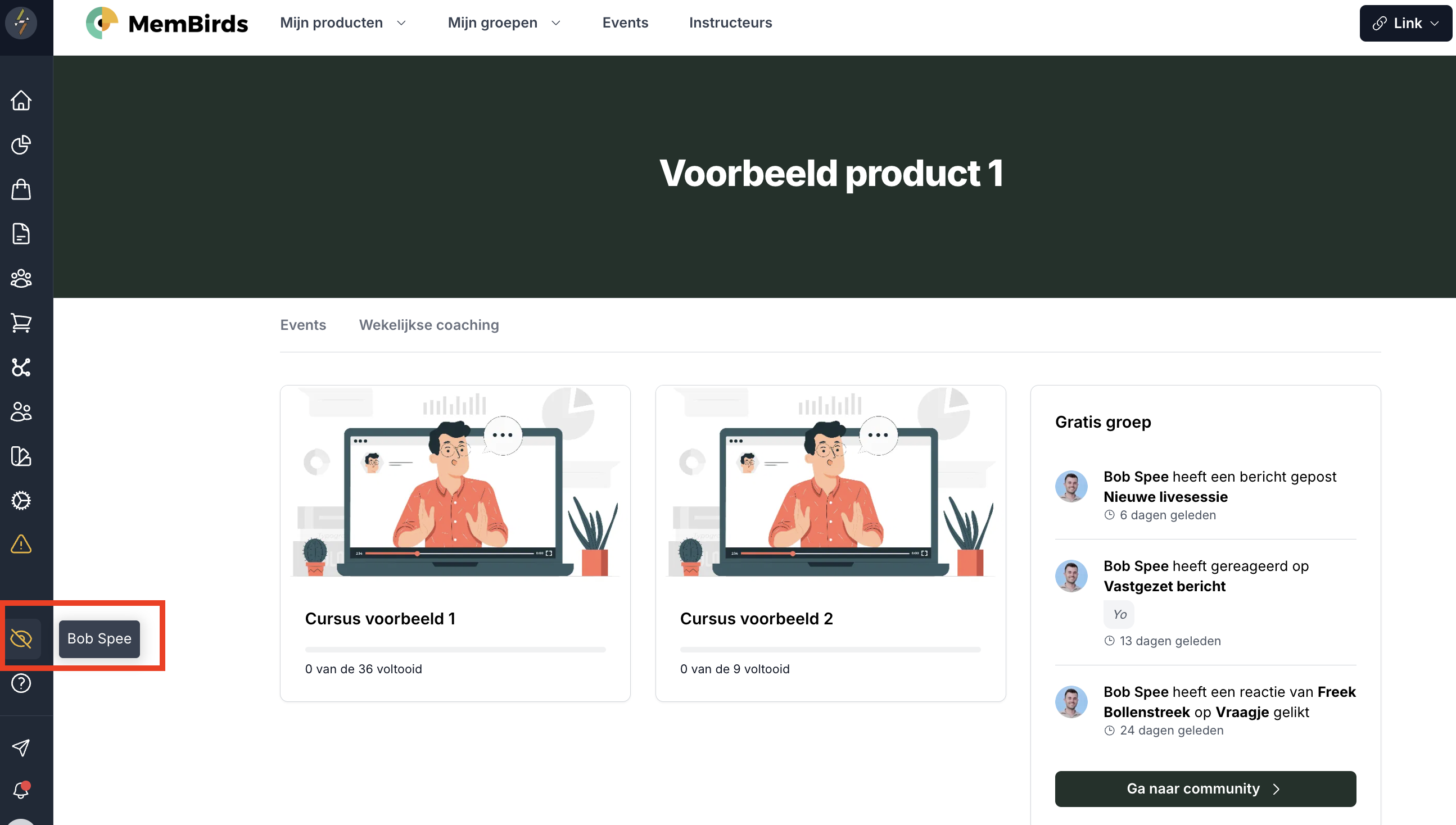 Hiervoor ga je links naar je menu balk van je MemBirds omgeving en klik je het "Oog" icoon en dan komt er "Bekijk als" te staan. Selecteer hier vervolgens het lid als wie je de ledensite wil bekijken. Klik vervolgens op een product. Nadat je dit gedaan hebt kun je exact zien welke modules en lessen dit lid heeft afgerond.