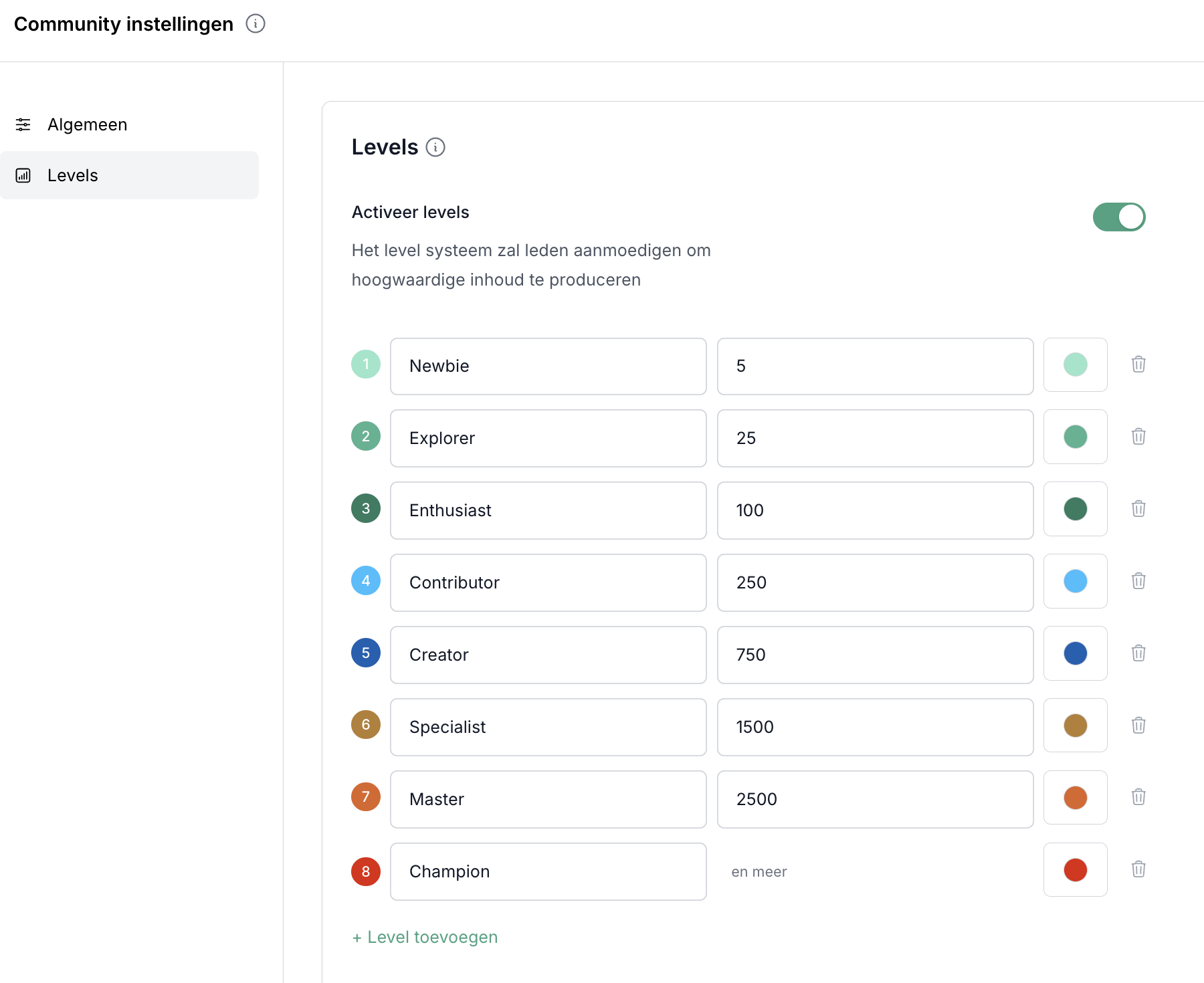 Je kunt de instellingen van het puntensysteem en de levels eenvoudig aanpassen via Community > Instellingen > Levels.