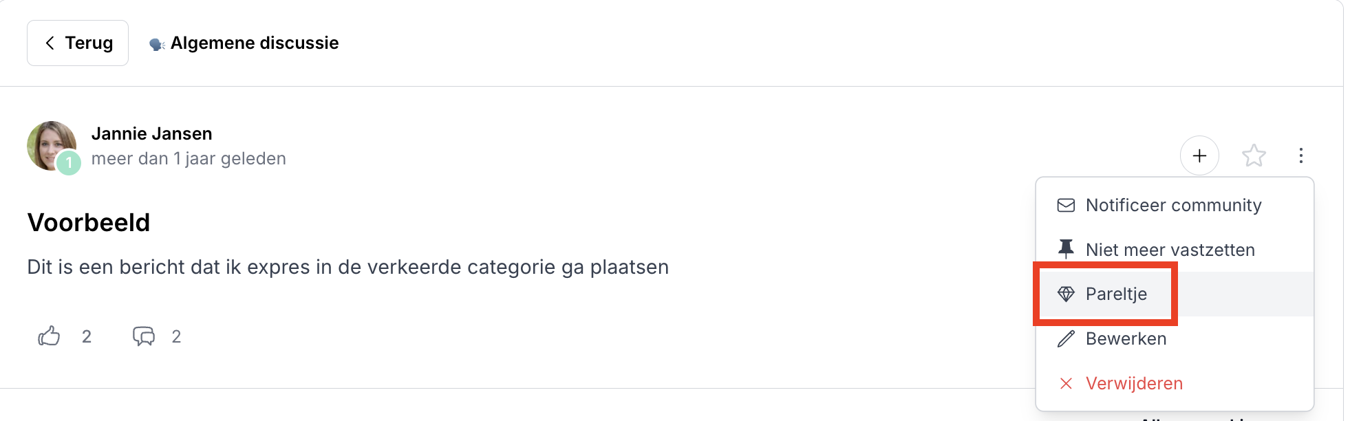 Als admin gebruiker heb je de mogelijkheid om leden extra waardering te geven door hun berichten te markeren als pareltje. Pareltjes zijn slechts beperkt beschikbaar en daardoor waardevoller dan een “gewone” like.