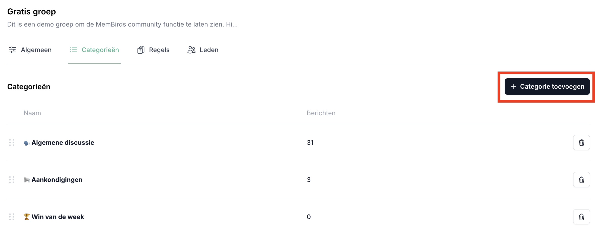 Binnen een groep kun je één of meerdere categorieën aanmaken waarin leden berichten kunnen plaatsen. Zo blijft het overzichtelijk en voorkom je dat alle berichten op een grote hoop belanden. Categorieën aanmaken doe je via Categorieën > Categorie toevoegen