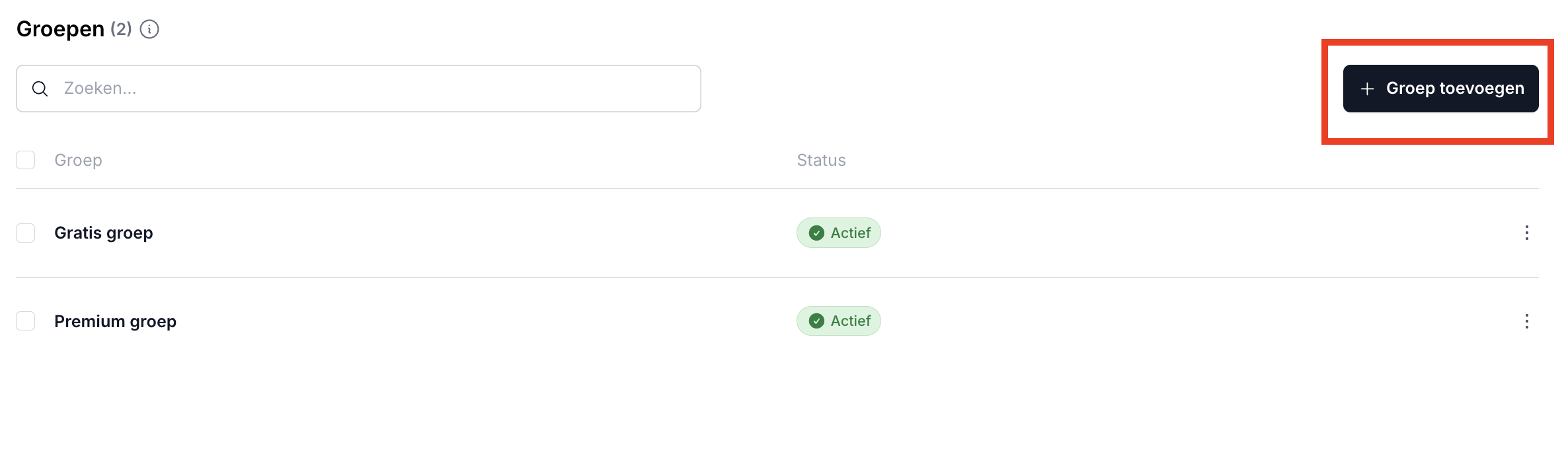 De eerste stap is het aanmaken van een groep. Dit kun je doen via Community > Groepen > Groep toevoegen en het aantal groepen wat je kunt aanmaken is onbeperkt.