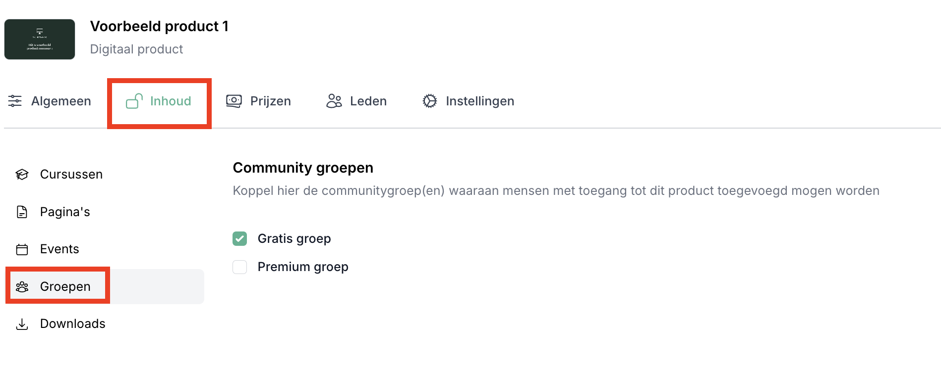 Allereerst dien je de groep dus te koppelen aan een Product. Dit doe je door binnen het product te gaan naar Groepen > Gekoppelde groepen > Selecteer de betreffende groep waartoe leden van dit product ook toegang moeten krijgen.