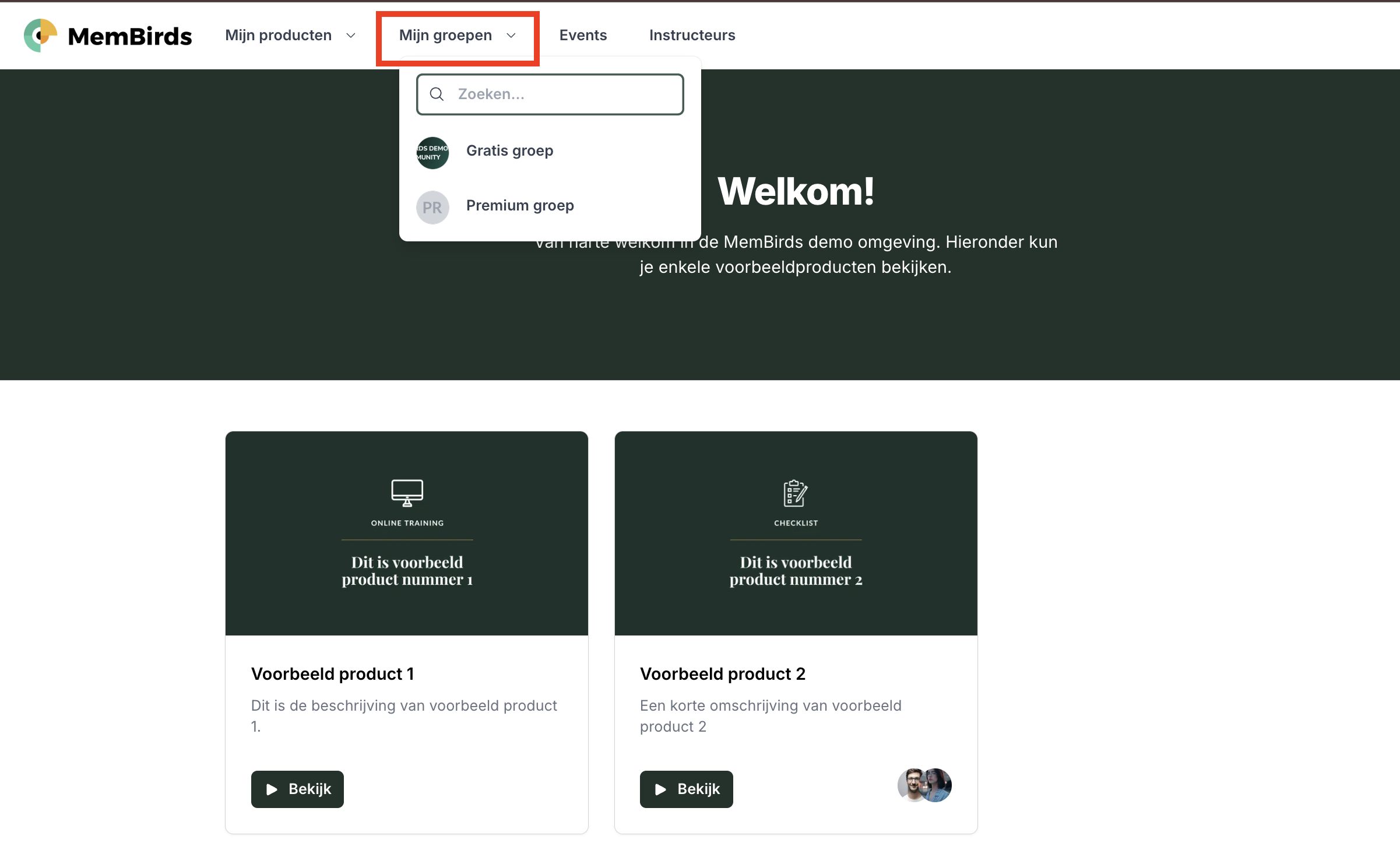 Nadat een lid toegang heeft gekregen tot een product/groep, kan hij of zij de groep terugvinden in het hoofdmenu onder "Mijn groepen"