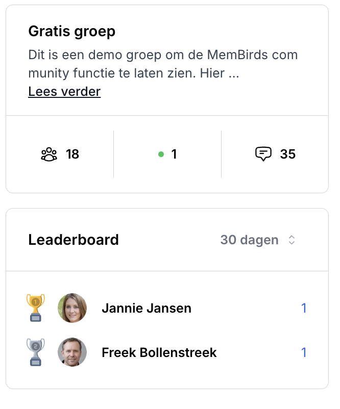 Binnen onze community zit een Leaderboard functie ingebouwd. Hiermee worden de leden die de meeste waarde toevoegen aan de community beloond. Deze vorm van gamification zorgt er ook voor dat leden extra actief zijn en blijven in je community.