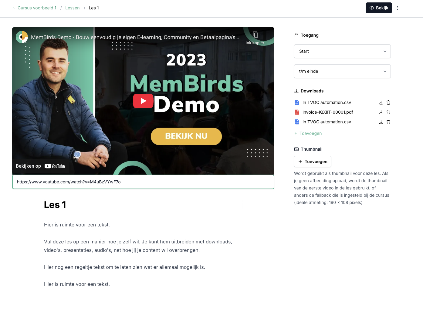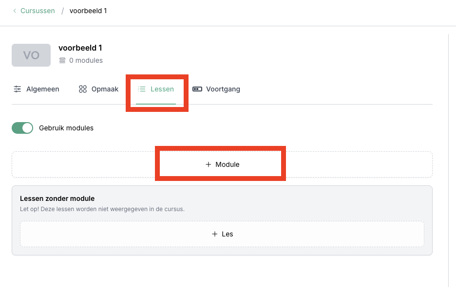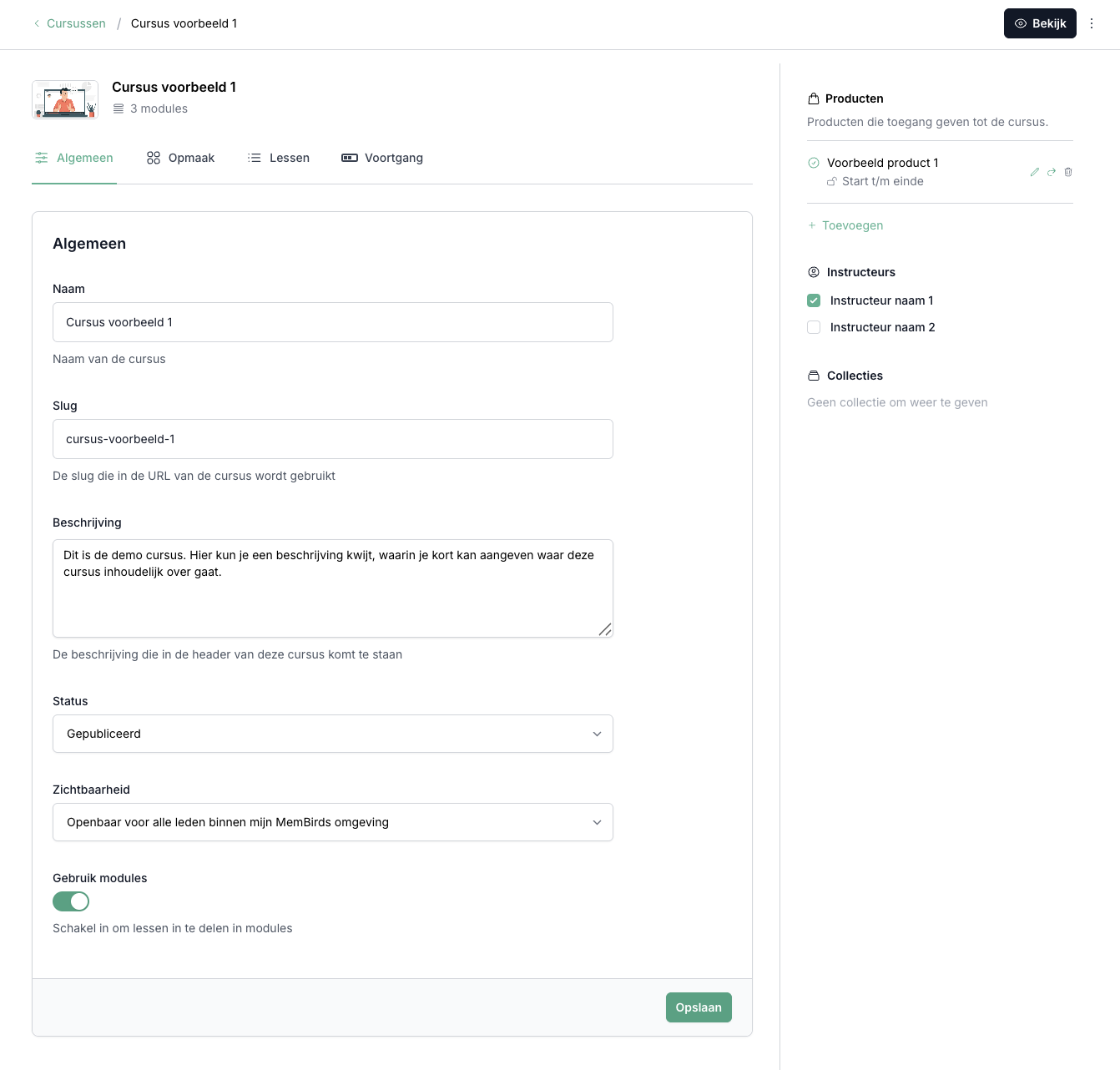Om te beginnen ga je vanuit je MemBirds dashboard naar Content > Cursussen > klik rechtsboven Cursus toevoegen. Bepaal nu de naam van je cursus en klik op Toevoegen. Je kunt nu enkele algemene instellingen van de cursus wijzigen, zoals de zichtbaarheid, omschrijving en status. Ook kun je hier aangeven of je cursus enkel uit losse lessen bestaat of is opgebouwd is uit modules die elk uit 1 of meerdere lessen bestaan. Nu is het tijd om de cursus te gaan vullen met modules en lessen. Klik hiervoor op het kopje Lessen en maak een nieuwe module aan. Nadat je de module hebt aangemaakt krijg je de mogelijkheid om lessen toe te voegen aan de zojuist aangemaakte module