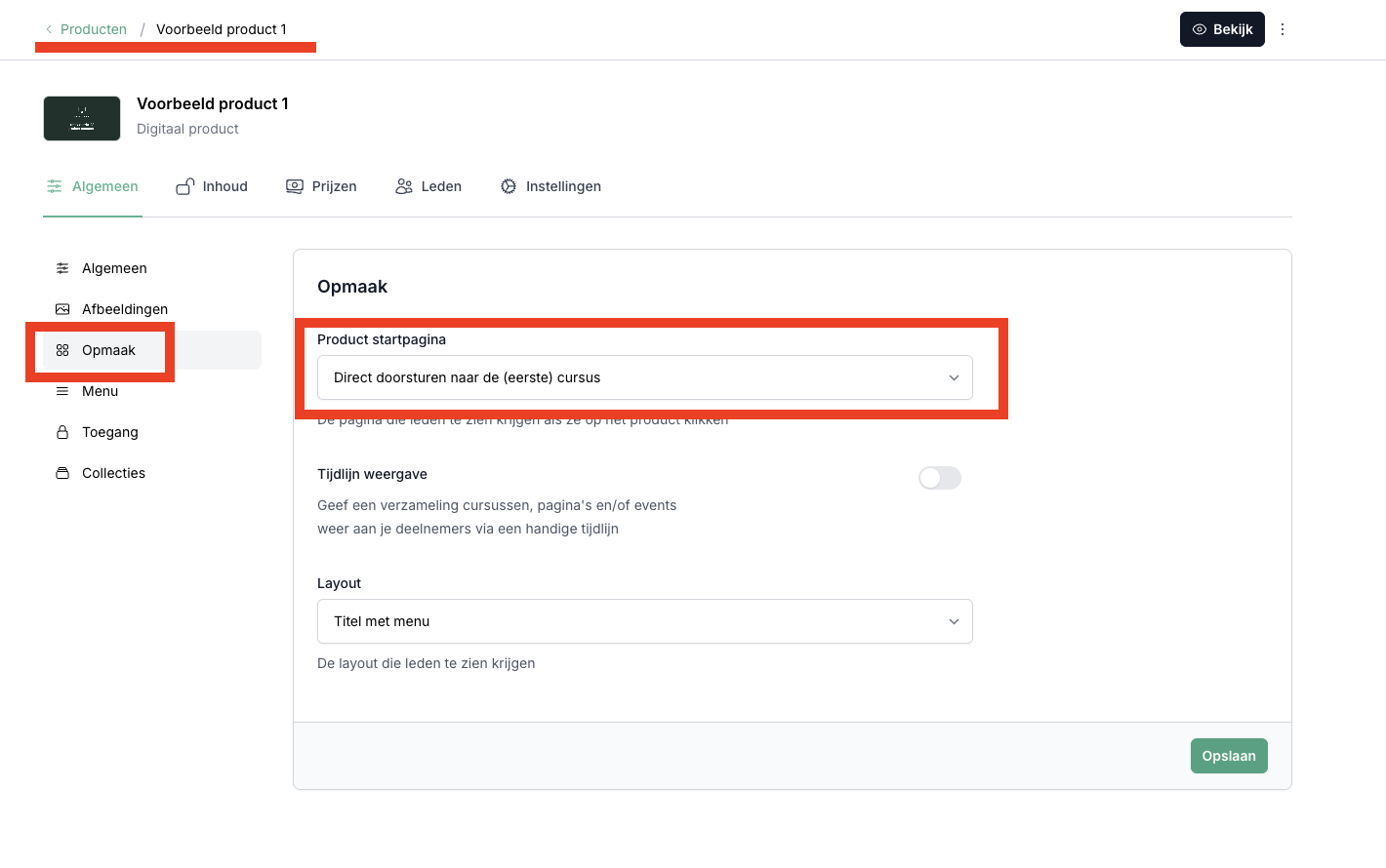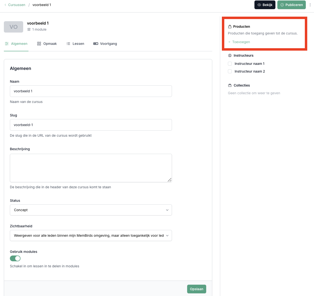 Nadat je je cursus gevuld hebt met modules en lessen zet je de cursus op "Gepubliceerd" en is het tijd om de cursus te gaan koppelen aan een Product. Dit zie je staan rechts in het overzicht van de cursus. Dit kan dezelfde naam zijn als de naam van de cursus die je zojuist hebt aangemaakt.