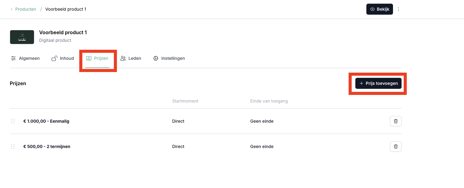 Tot slot is het tijd om een prijs toe te voegen aan je product. Ook dit kun je weer instellen via het menu, bij Prijzen. Wanneer je klikt op Prijs toevoegen kun je bepalen of je je product wil verkopen door middel van een eenmalige betaling, termijnbetaling (of allebei) of een abonnement.