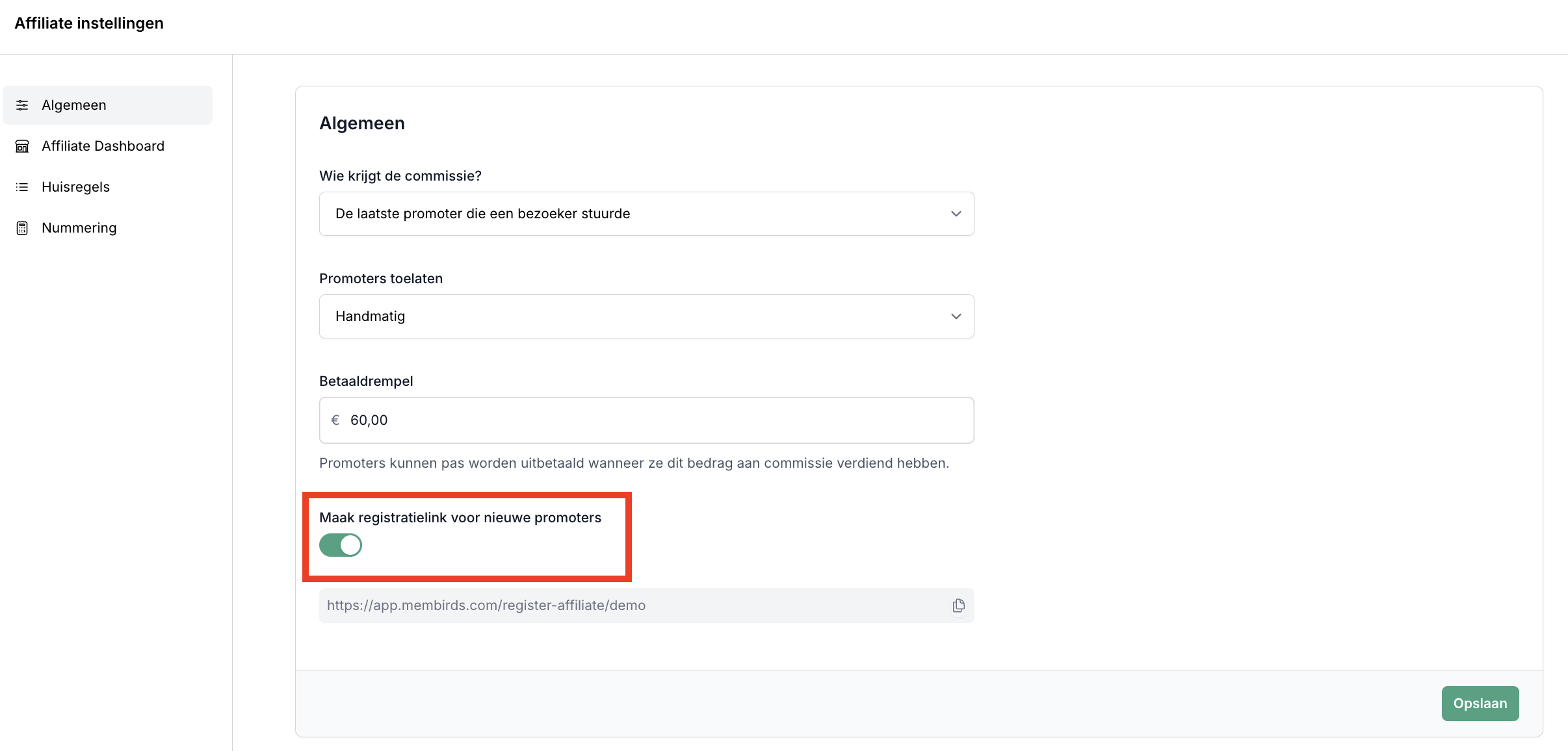 Die uitnodigingslink maak je als volgt: Ga naar Affiliates > Instellingen > Vink "Maak geheime registratielink" aan en deel deze vervolgens met je mensen.