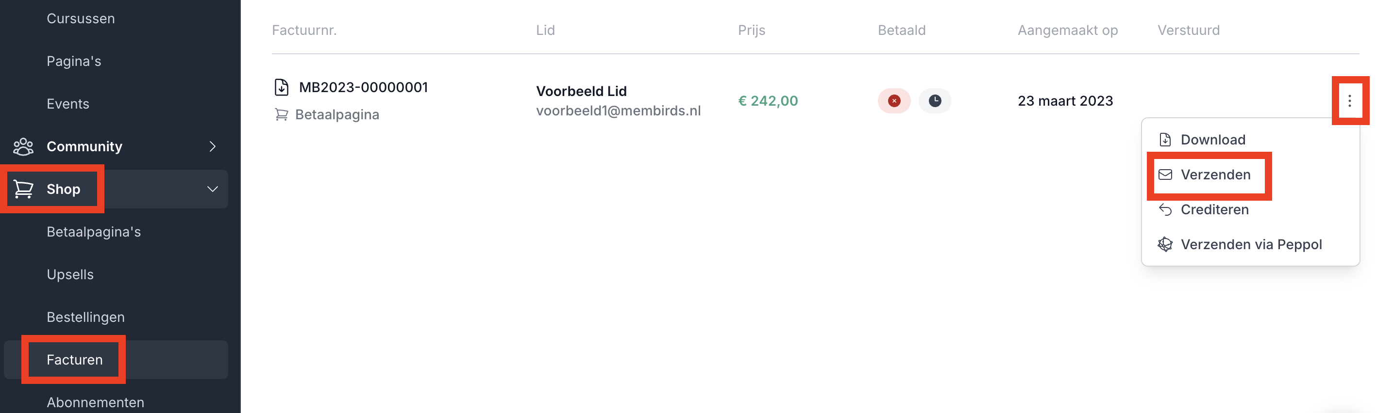Ga naar Shop > Facturen en zoek daar de factuur die je wilt versturen. Klik vervolgens op de 3 puntjes aan de rechterkant > Verzenden. Vanuit MemBirds wordt er nu een mail verzonden naar de klant met een PDF factuur. Nadat je op "Factuur versturen" geklikt hebt verandert het envelopje in een groen vinkje om aan te geven dat de mail inderdaad verzonden is naar je klant.